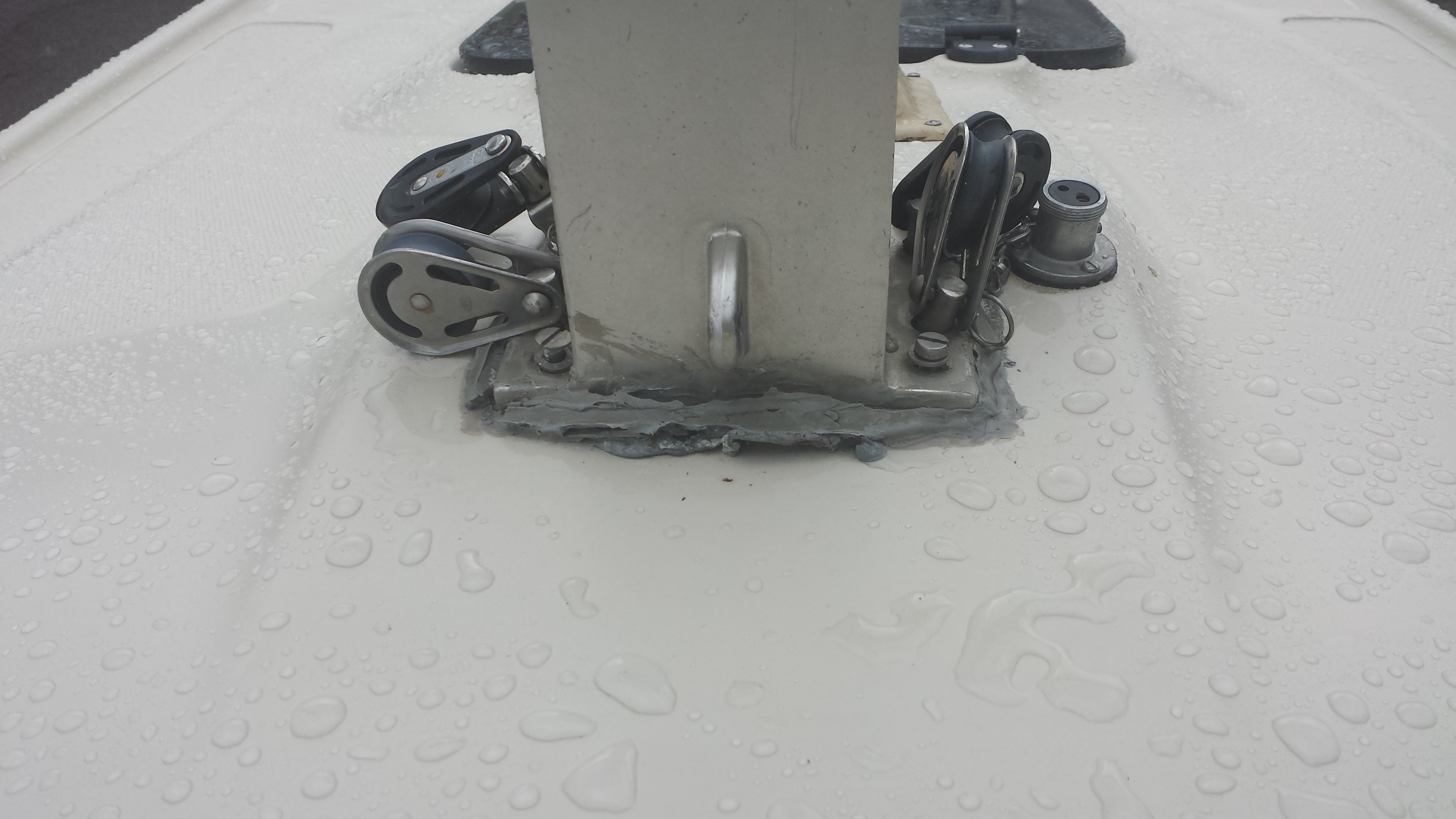 Der Koker selbst ist mit Dichtmasse auf das Deck geklebt.