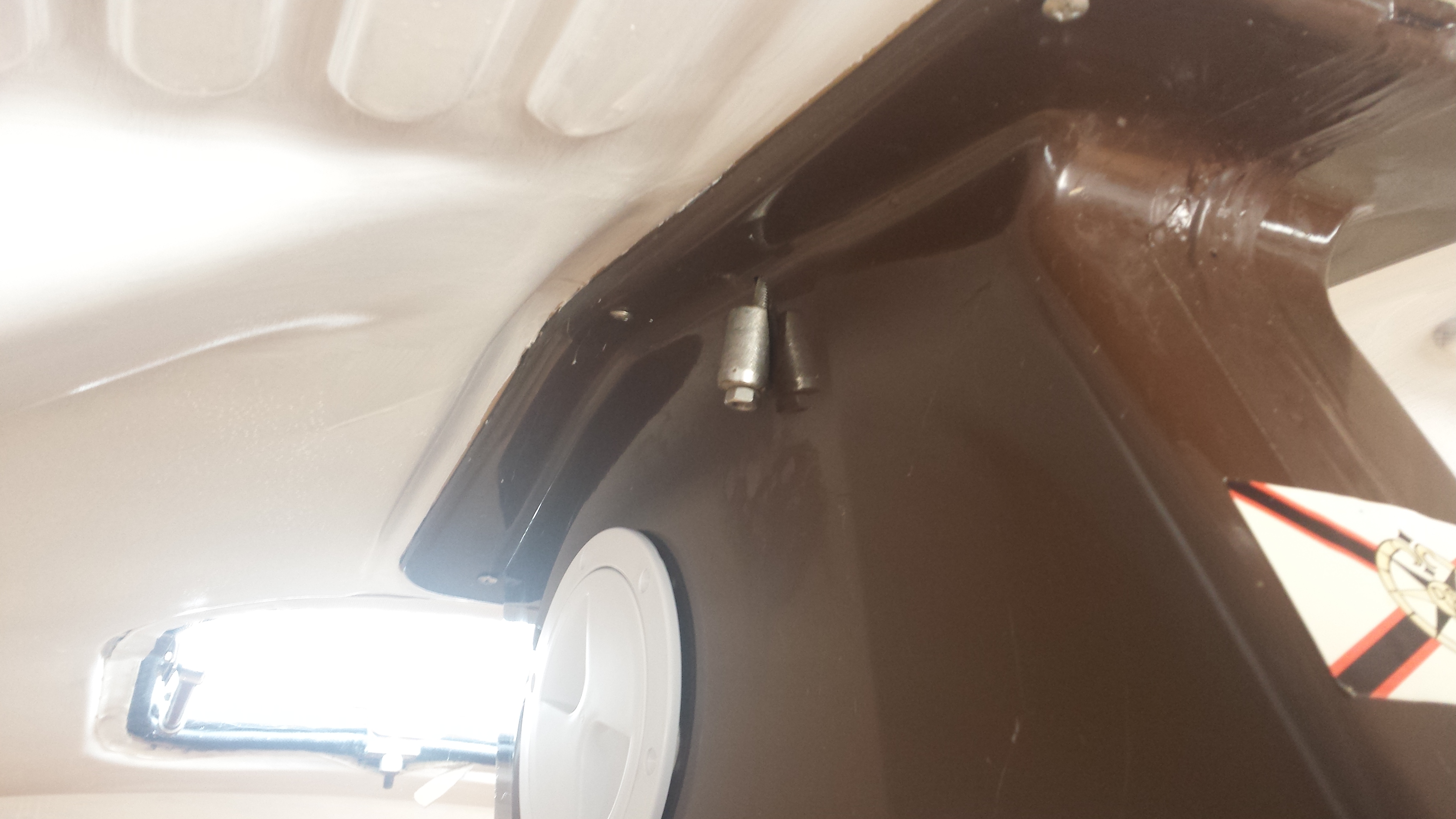 Den Mastkoker habe ich eben ausgebaut. Da hat einer ganz schön gefummelt. Scheinbar hat der Mast mal beim stellen geklemmt. Beim nach vorne ziehen hat es wohl die beiden hinteren Schrauben raus gerissen und der Koker leicht verbogen. Das ganze wurde dann gemäß dem Prinzip Hoffnung mir Silikon voll gekleistert.