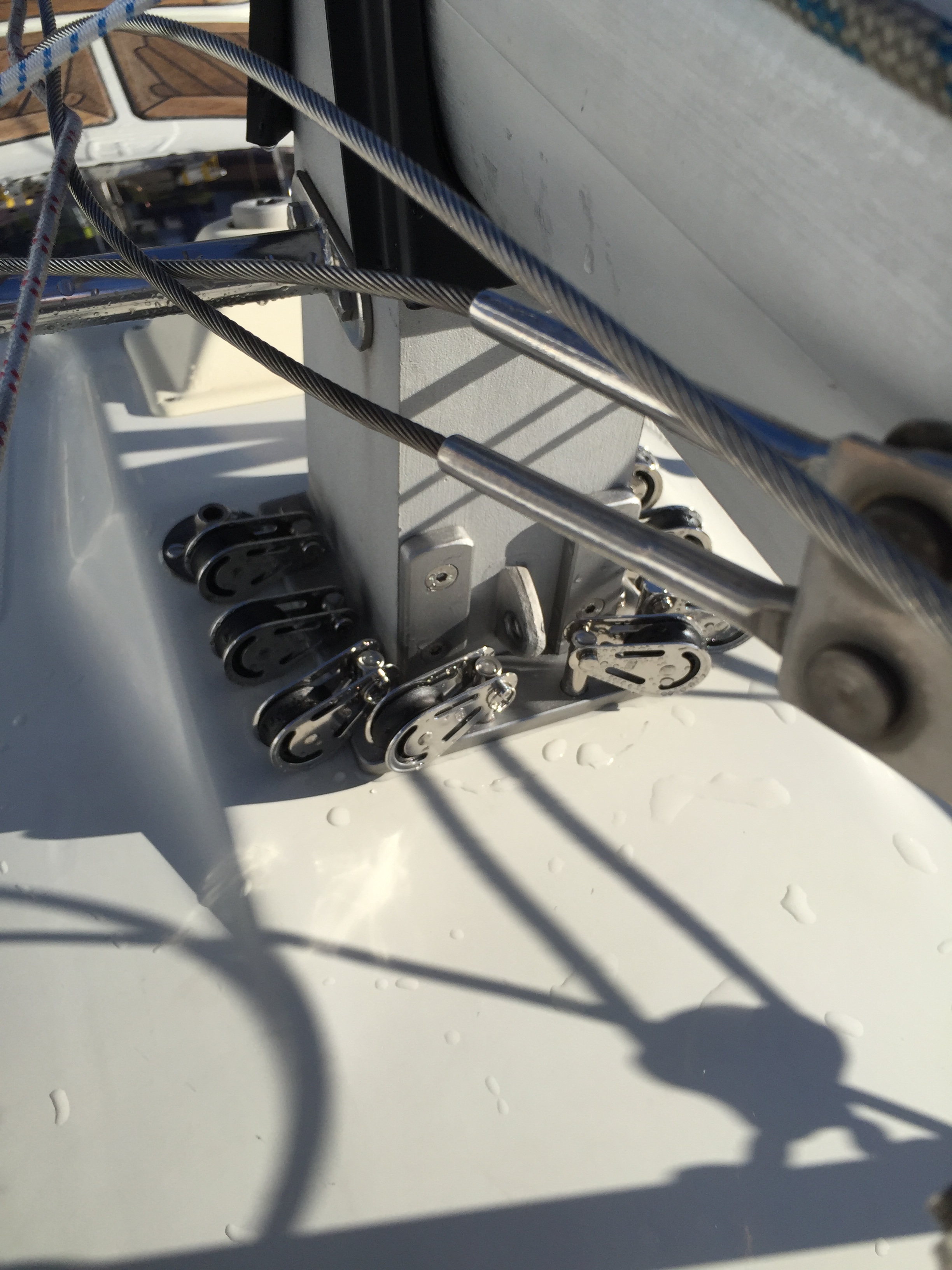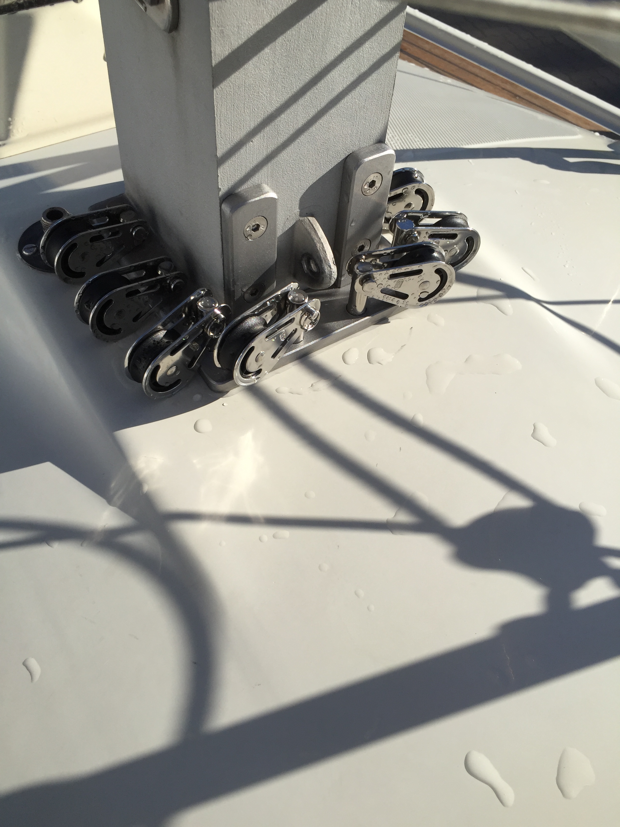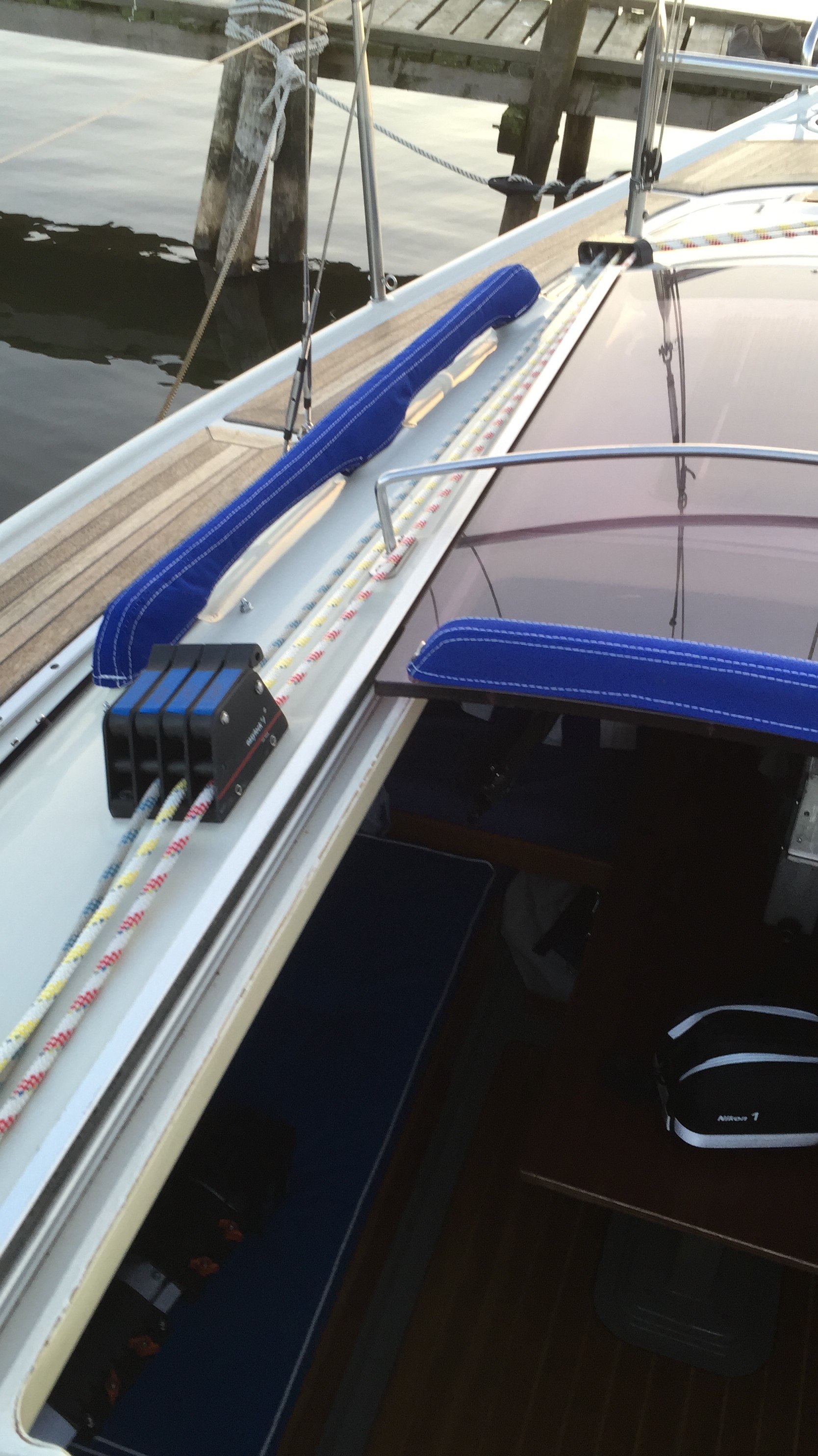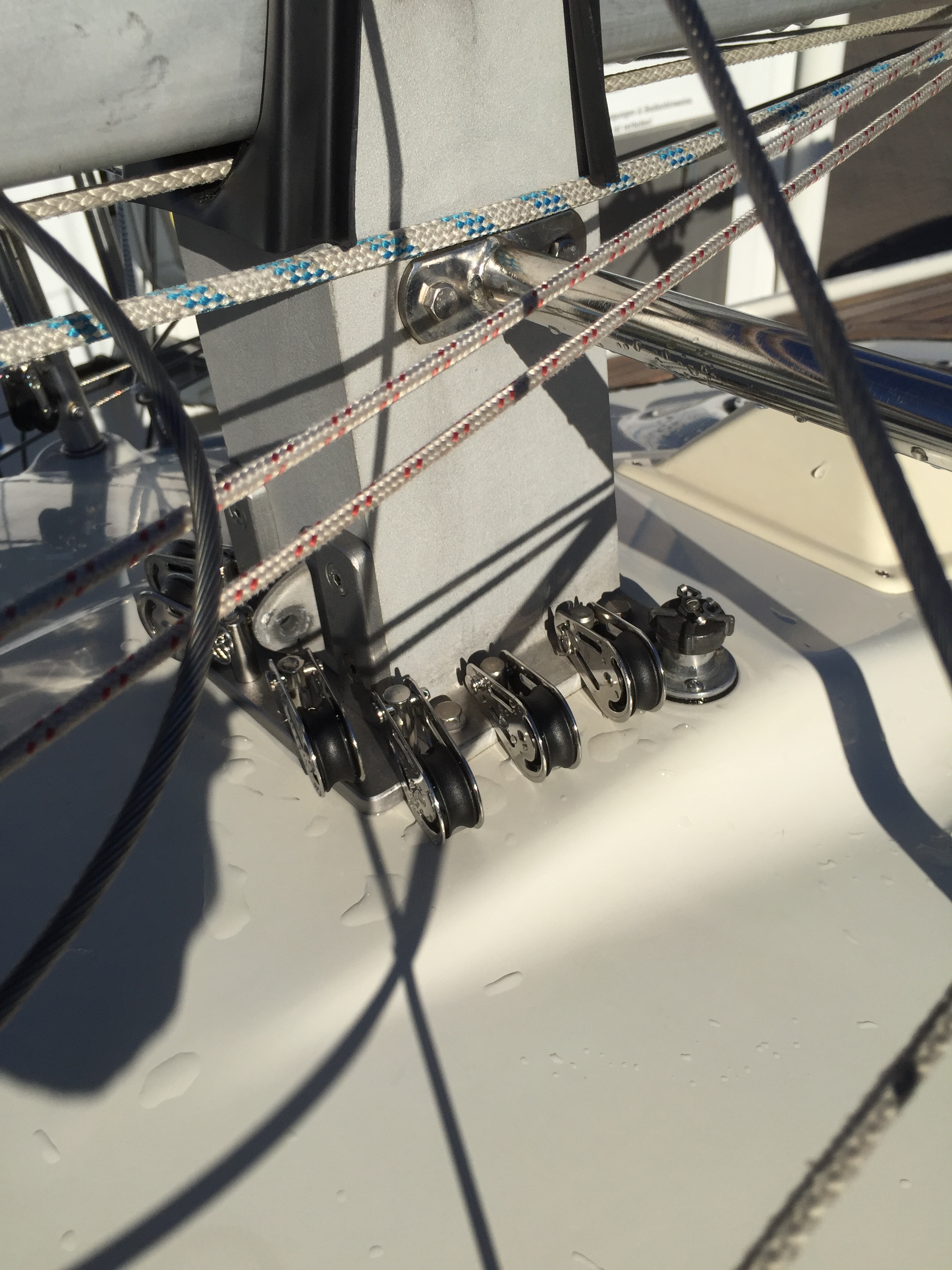 der ein oder andere von euch hat sich bestimmt auch schon mal mit dem thema umlenkung von fallen und reffleinen ins cockpit beschäftigt. der austausch bzw. die erweiterung der fallenstopper auf dem hinteren teil des kajütdaches dürfte das kleinste problem sein. gleiches gilt auch für die erweiterung der umlenkung auf dem vorderen kajütdach.