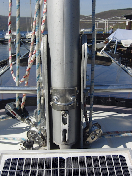 Ich bin mit dem original Mastfuss aus Guss-Alu übrigens nicht zufrieden, da er schon bei recht geringer Biegung der Seitenflanke (dem Voreigner ist wohl der Mast mal schief gekommen) einen Riss bekommen hatte.