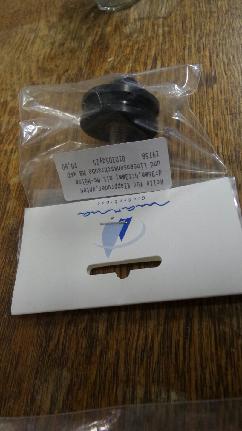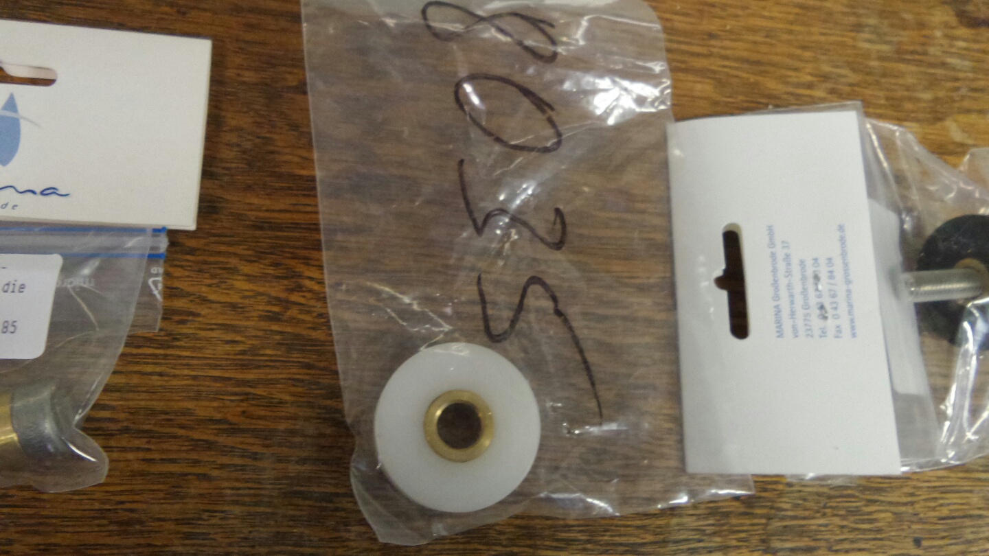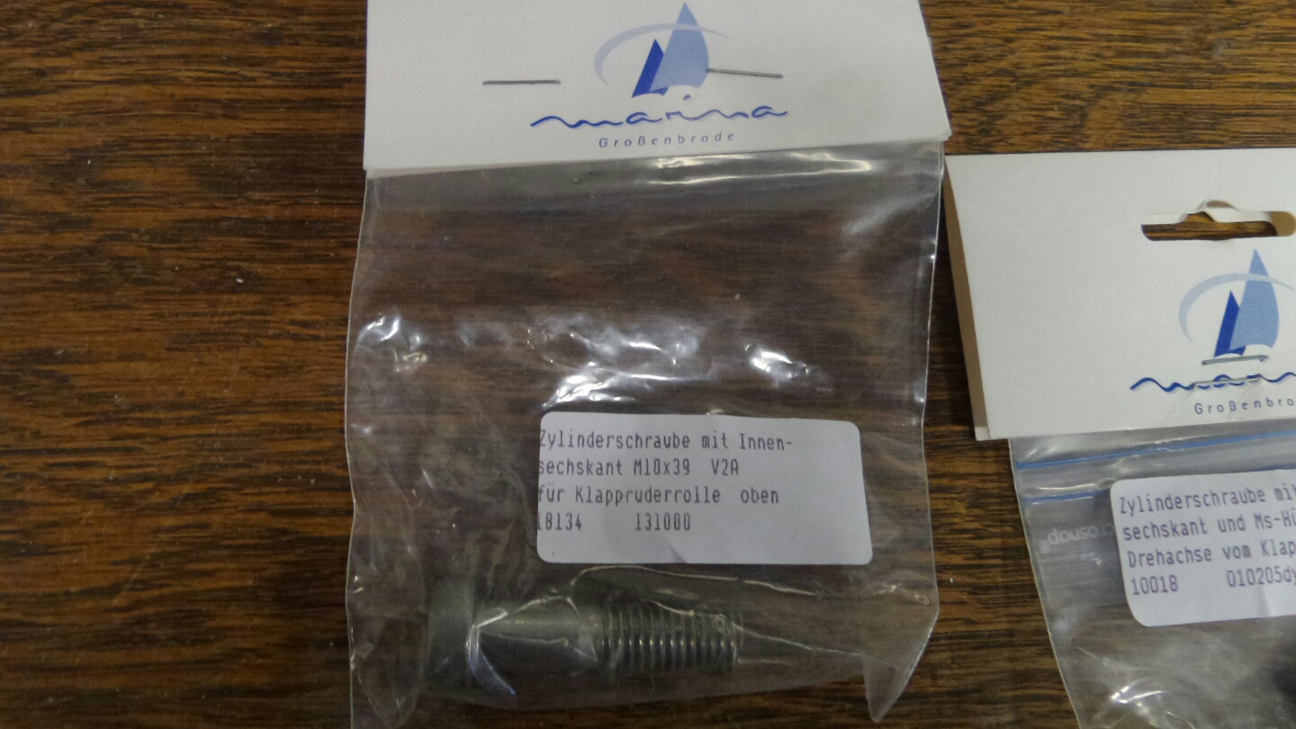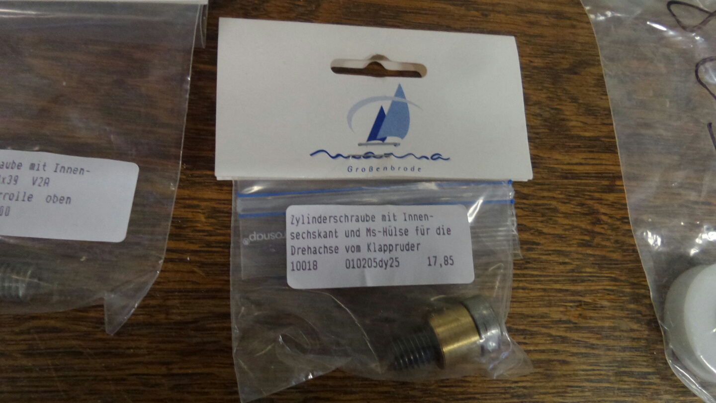 Vor ein paar Jahren habe ich mein Klappruder komplett saniert. Damals habe ich zur Vorsicht bei der Marina Grossenbrode (heute Marina Team) alle Schrauben, Bolzen und Umlenkrollen für Auf- u. Niederholer doppelt bestellt. die Teile habe zusammen über 100 Euro gekostet.