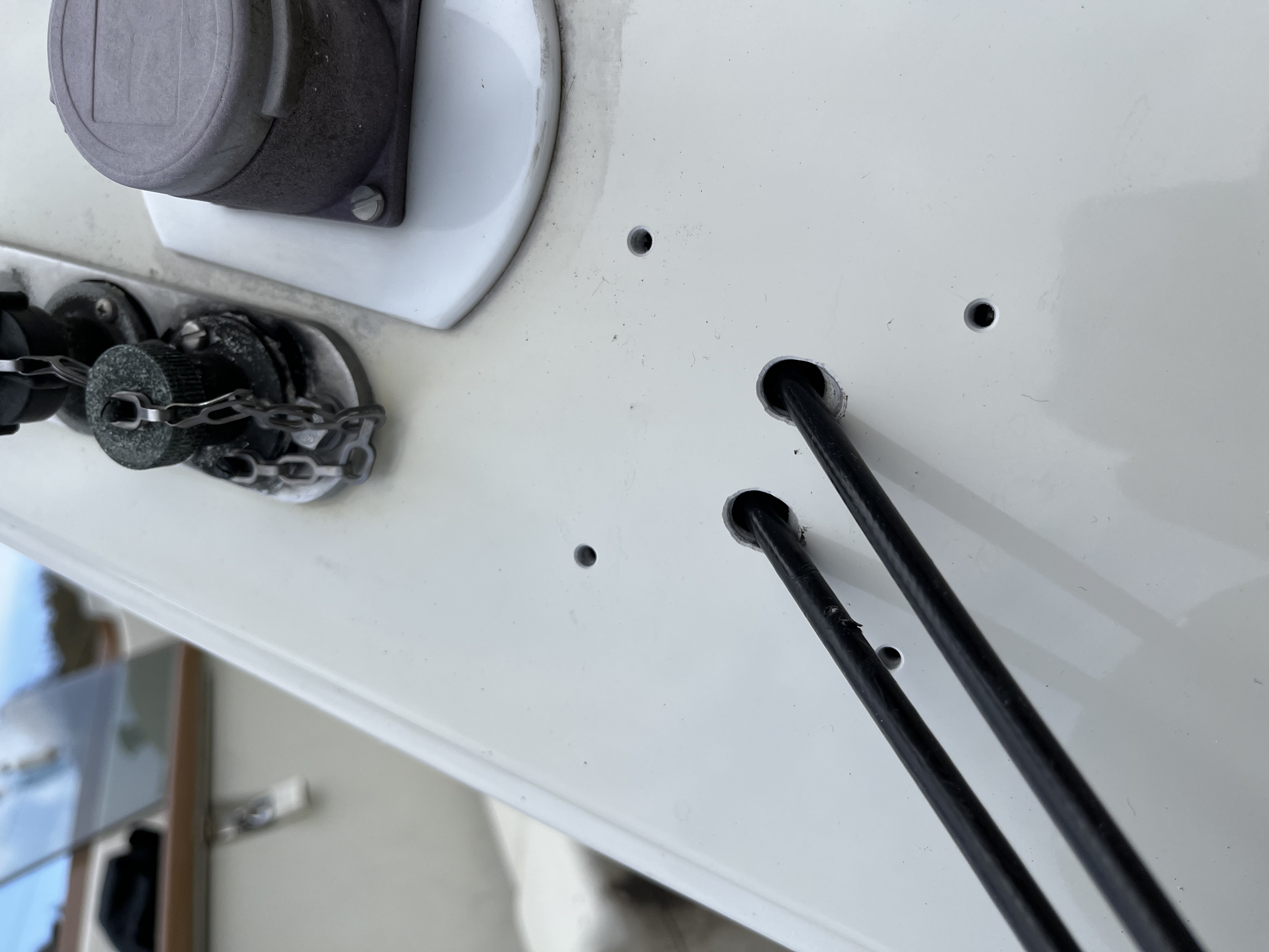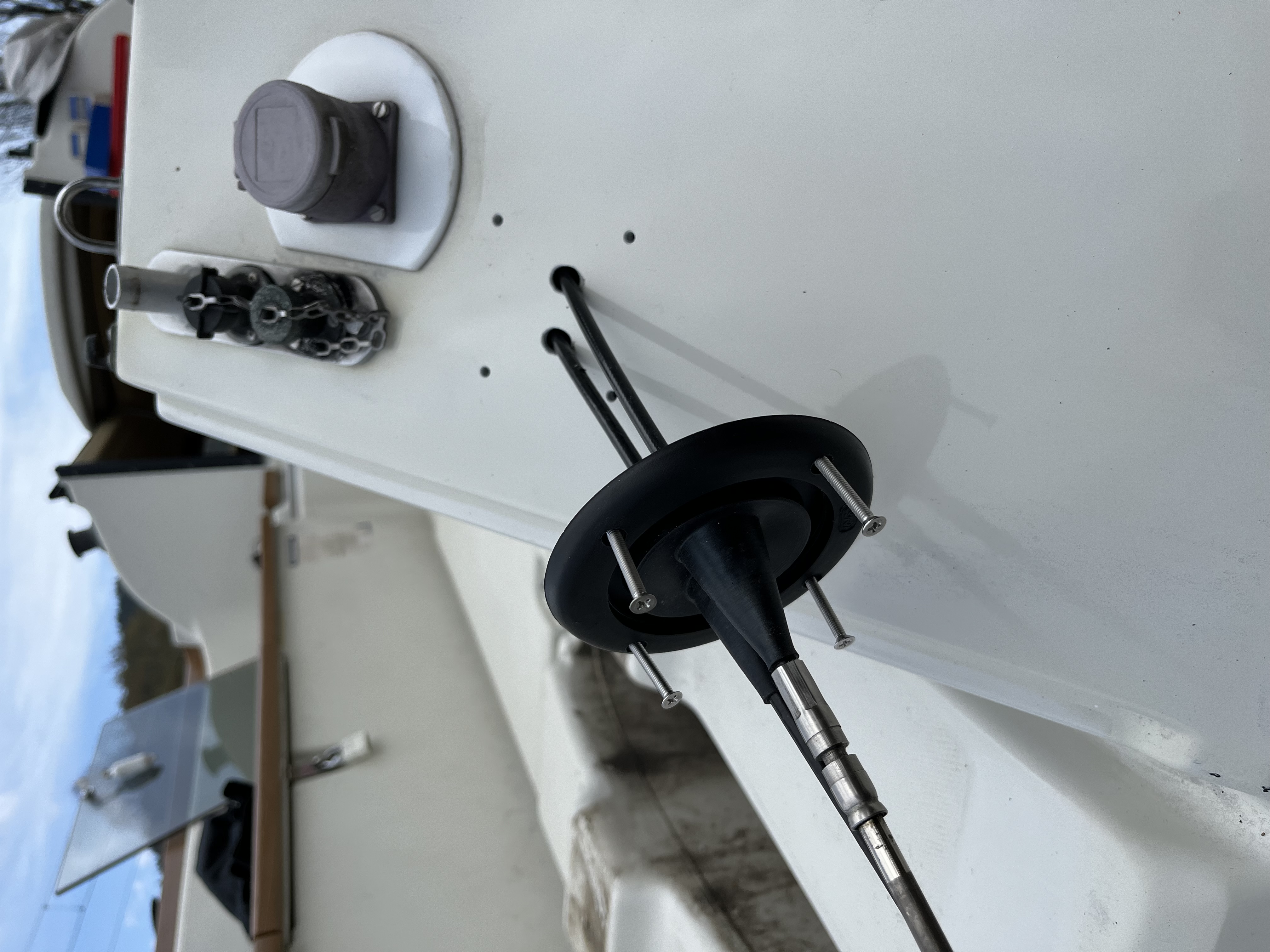 Moin, Nachdem der Vorbesitzer um 1990 rum nur einmal den Benzinmotor und dannach nur noch den Elektromotor genutzt hat war statt eines Auslasses für die Fernbedienungskabel aus der Steuerbord Backskiste nach Achtern eine gut dimensionierte Steckdose für den Elektromotor seitdem dran.