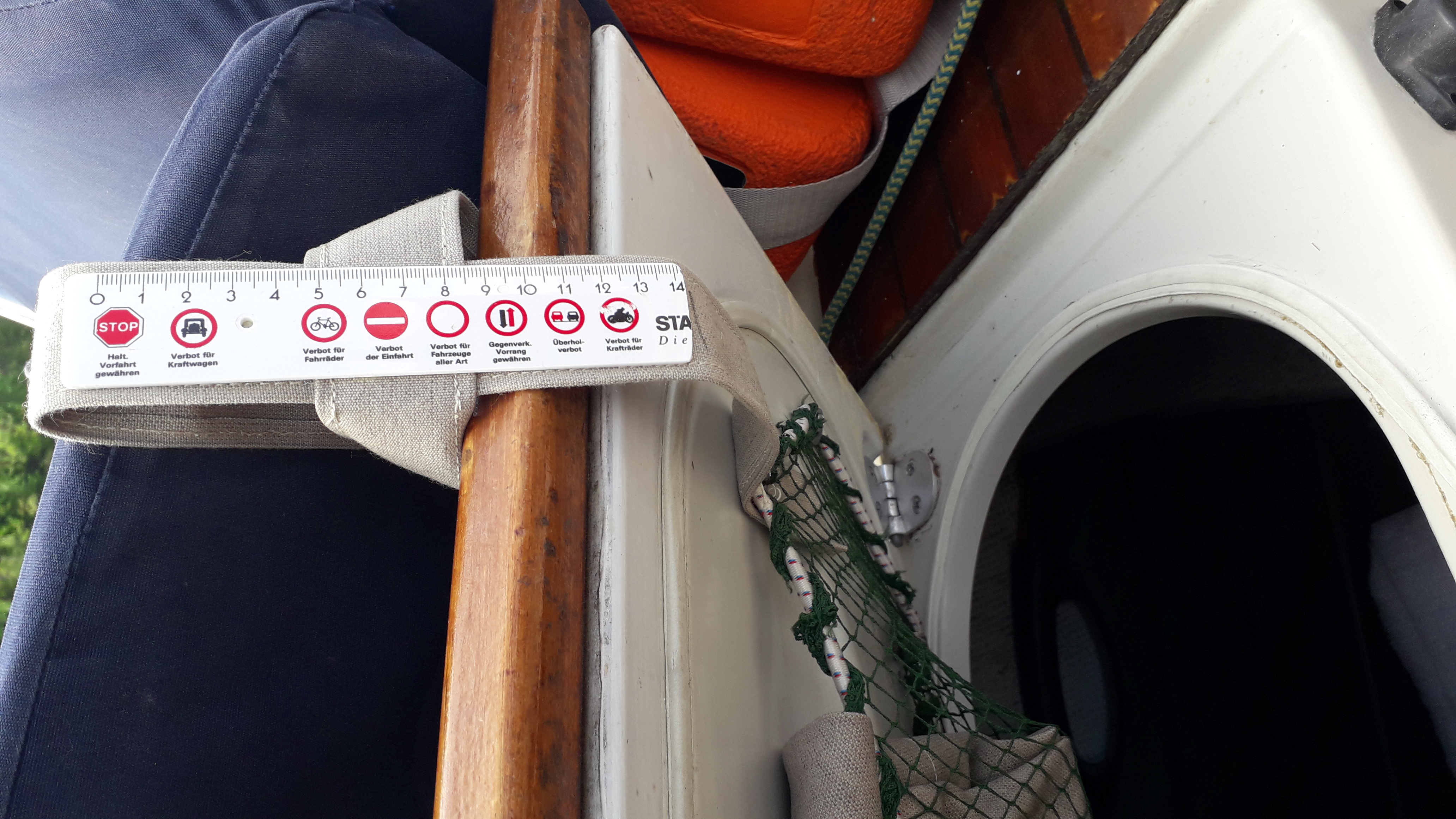 So, die Getränkehalter haben sich auch beim Segeln gut bewährt! Ich habe nur noch auf der Rückseite provisorisch ein Linealstück aufgeklebt, damit das Gurtband steifer wird und nicht mehr pendelt.