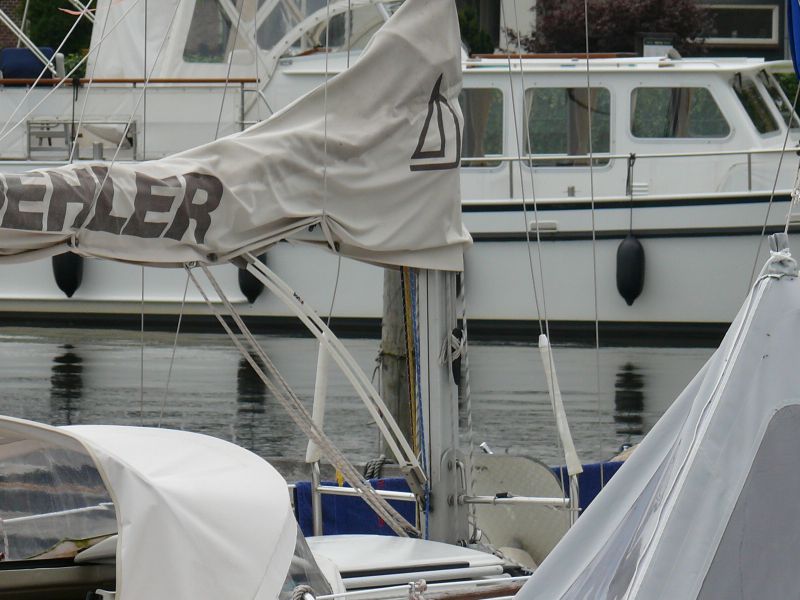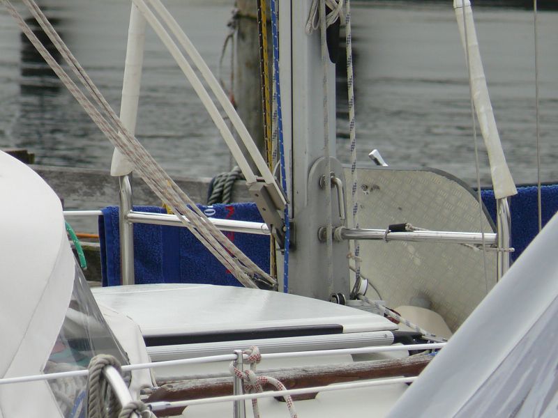 Die Stäbe lassen sich in Grenzen kürzen, allerdings habe ich meine nicht gekürzt. Für die Befestigung in der Mastnut wird in Gegenstück mitgeliefert, dass in die Nut eingeführt wird. Ich benutze das nicht, weil der Fuß des Kickers dann etwa 20 cm höher sitzt müsste, um beim Mastlegen nicht gegen den Koker zustoßen.
