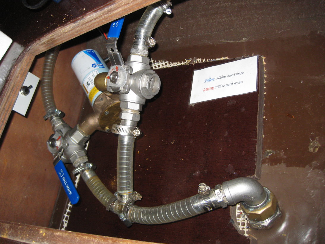 Habe dazu das Ballastventil umgebaut und kann es nun per Schraubstutzen verschließen. Der Tank wird einfach über eine Lenzpumpe aufgefüllt oder entleert. So kann ich bei Binnenfahrten und wenig Wind leer fahren und bin schneller als mit Wasserballast. Wenn es mal auf der Adria hart kommt, wird der Wassertank komplett vollgepumpt. Ist es dort windstill und ich motore, kommts Wasser wieder raus und ich spare Sprit!