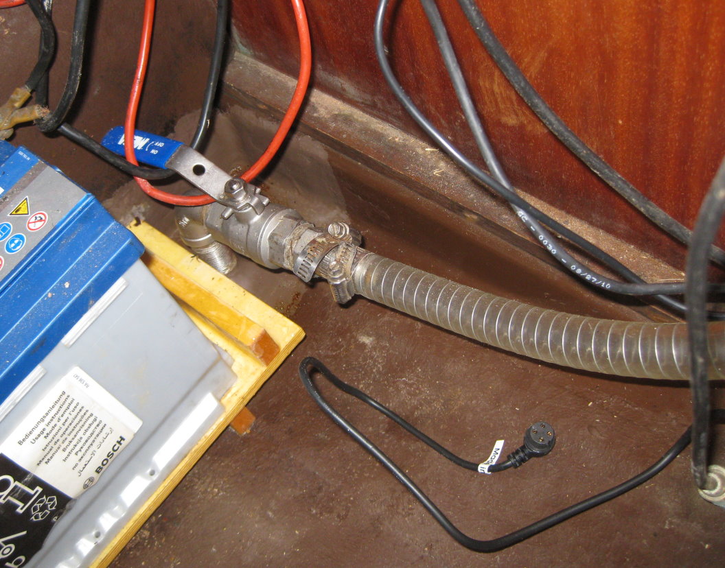 Der Schlauch geht zur Pumpe, die rechts neben dem Niedergang unter der Sitzbank ist.