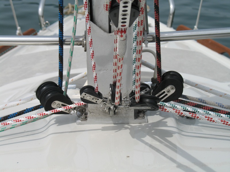 Ich habe nur die beiden Serienmäßigen Umlenkrollen auf dem Kajütdach benötige aber für das reff und die ins Cockpit geführte Dirk mehr Rollen.