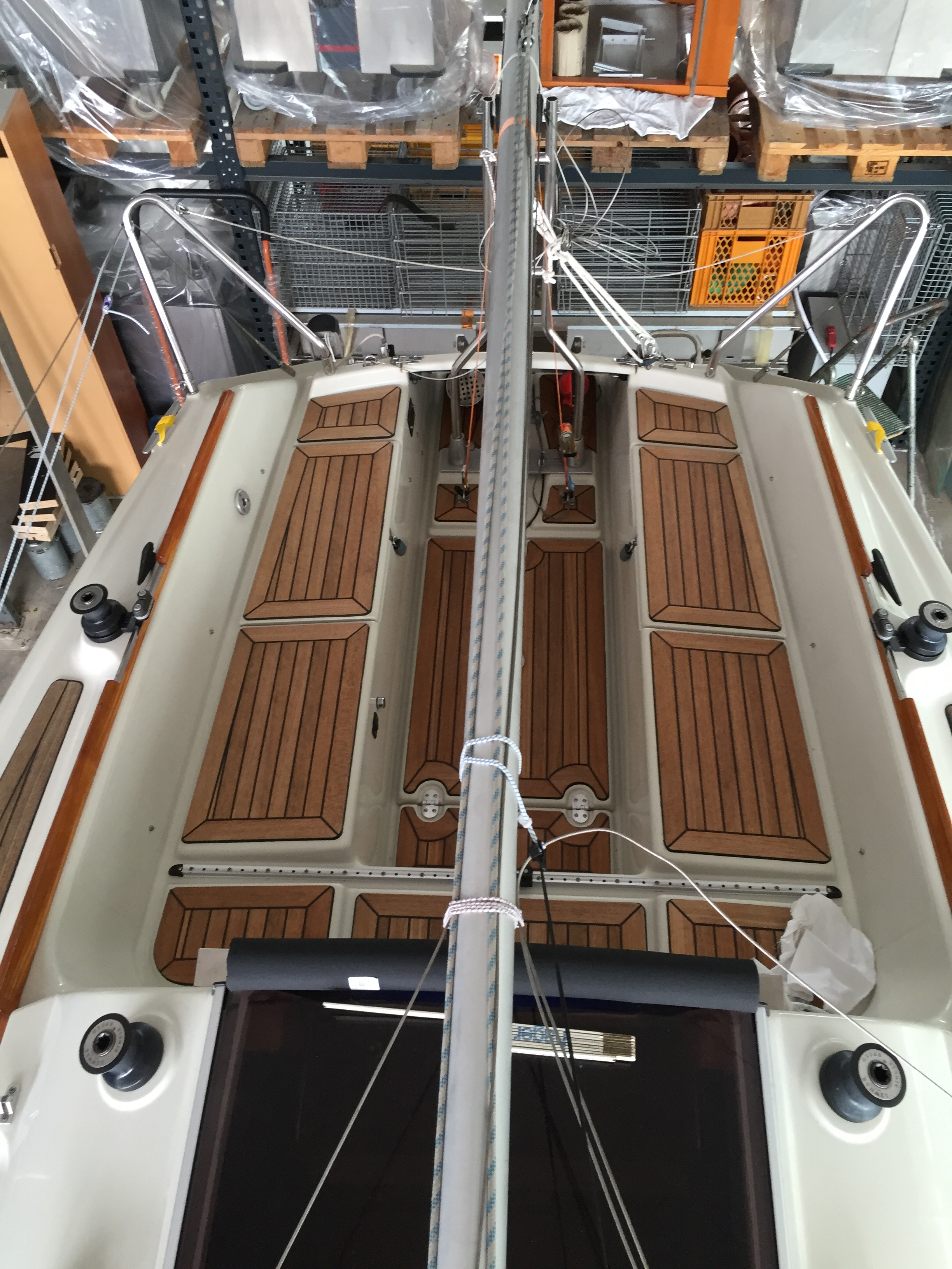 habe diesen Sommer in Italien festgestellt, dass sich der originale Decksbelag an schönen Sommertagen so stark aufheizt, dass man barfuß darauf nicht mehr laufen kann. Allerdings konnte ich auf dem Teakdeck im Cockpit immer gut barfuß stehen. Anscheinend überträgt das Teak die Hitze nicht so auf die Füße.