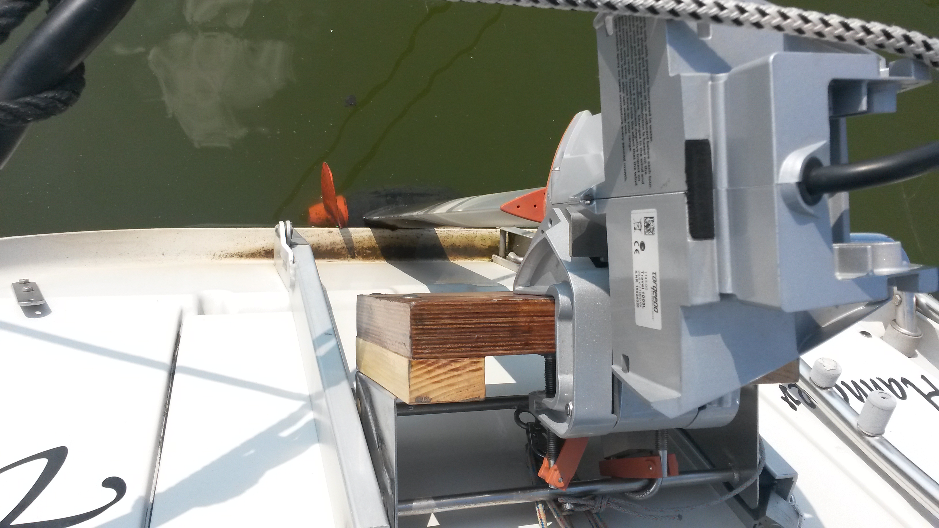 war heute nach dem Urlaub mal wieder beim Boot und habe Fotos gemacht. Der Propeller hängt nach dem maximalen Aufholen des Motors im Wasser. Entweder man lässt ihn dort (mache ich zur Zeit) oder man klappt den Motor hoch (mache ich nicht, weil ich den Torqeedo nicht so sichtbar präsentieren möchte). Der Nachteil ist dabei allerdings der Bewuchs, der sich jedch bislang gut abwischen ließ, und eine Verfärbung des Aluschaftes....