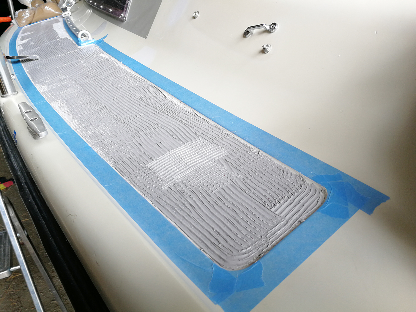 Als Kleber habe ich Sika 221i in grau verwendet. Dass habe ich so zusammen mit den Decksbelägen vom Marinateam bekommen.