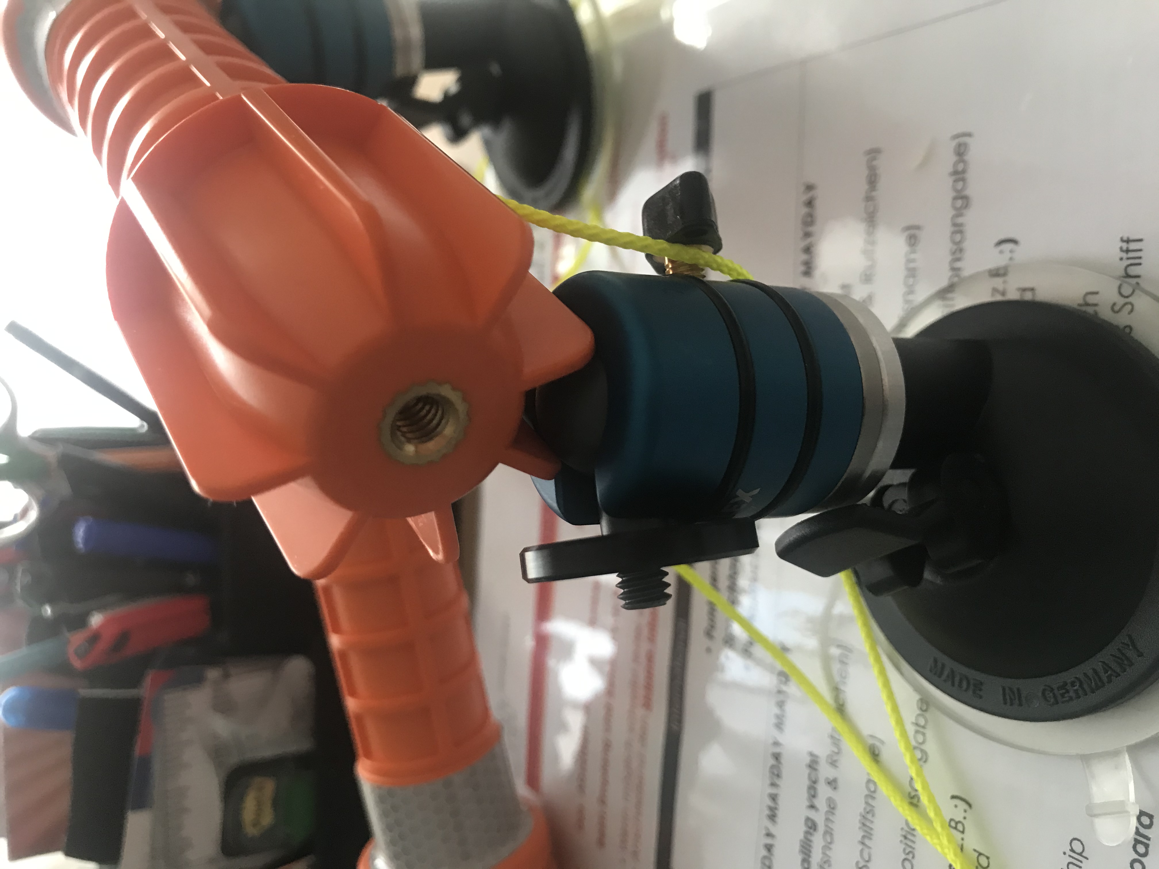 Ergänzt habe ich die FLARES um eine Saugnapfbefestigung um die Flares notfalls auch auf dem Kajütdach , der Haupt - Schottwand oder am Spiegel montieren zu können ; so hat man sofort wieder beide Hände frei , was in der Situation, in der man sich zum Einsatz dieses Notsignals entschließt, sicherlich sinnvoll ist ....