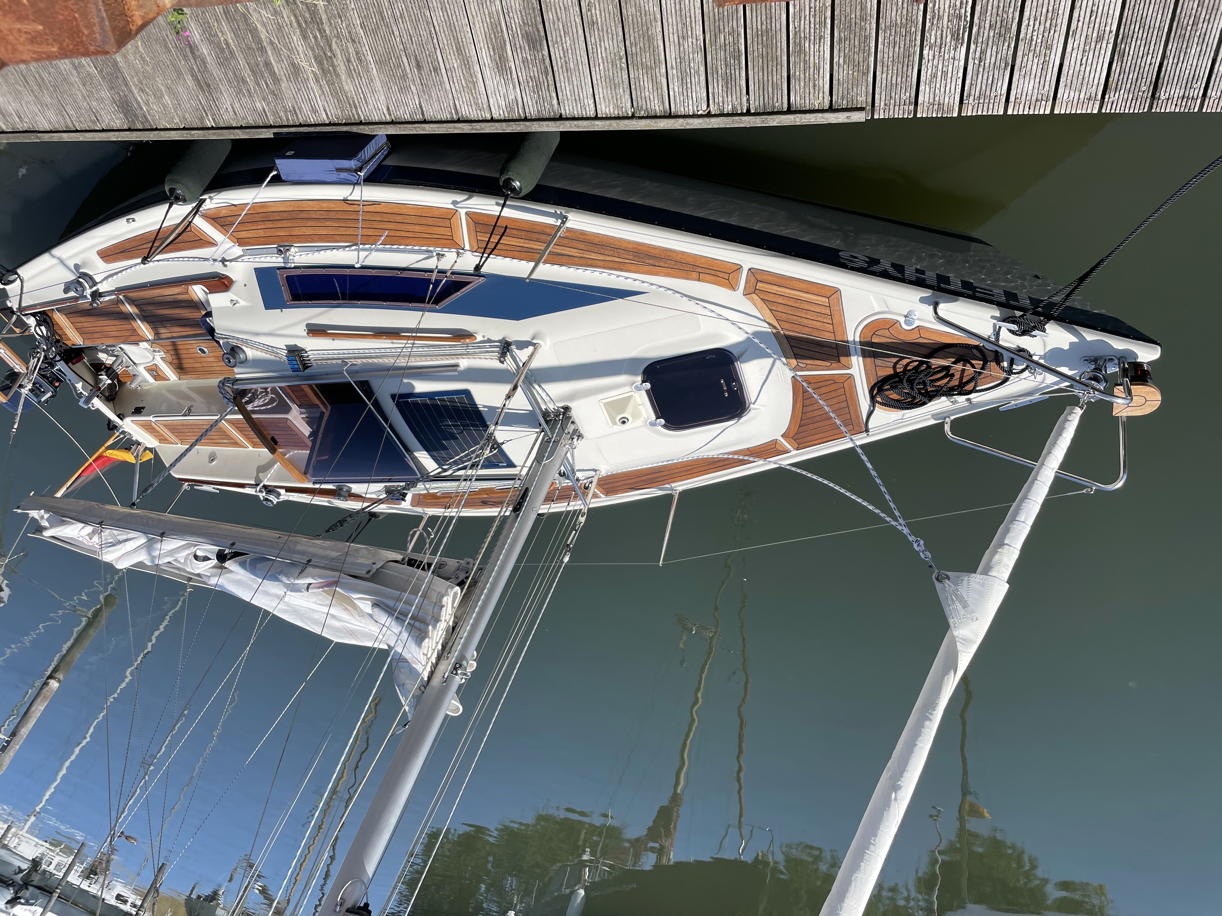 bei sommerlichem Wetter barfuß auf dem Schiff zu laufen ist ein absoluter Hochgenuß, auch wenn man immer, insbesondere an den Führungsösen für die Reff- bzw. Furlerleine am Fuß der Relingsstützen aufpassen muß, sich nicht an den Zehen wehzutun !!