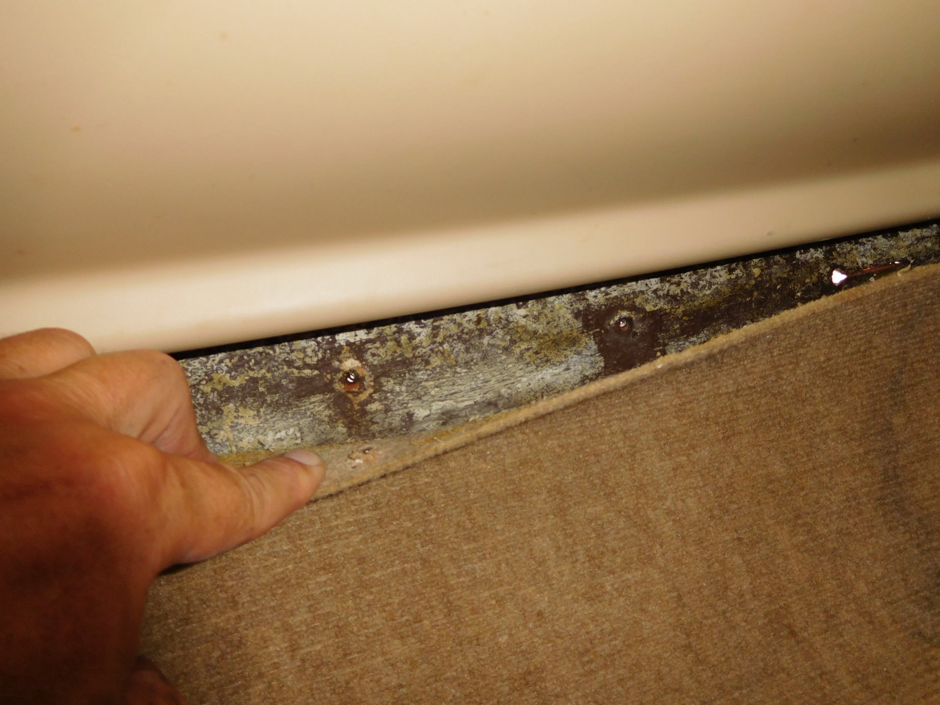 Ich ahne, das es an diesen gelösten Stellen zu Undichtigkeiten kommen wird. Spätestens wenn du auf STB-Bug mal mit ordentlich Schräglage segelst wird es auf der STB-Seite innen feucht bis nass werden. Grund: Die Scheuerleiste ist nur mit ordinären Holz/Spaxschrauben verschraubt, die in die überlaminierte Rumpf/Decksverbindung reingezogen sind. Ein andauerndes Ärgernis und eine ganz klare Schwachstelle durch die damalige Dehler-Sparpolitik.Eigentlich gehören an diese Stelle Schlosschrauben, die beidseitig dick in Sika o. ä. einglegt sind. Wurde aber seitens Dehler nicht gemacht, weil man innen durch die Dachinnenschale kaum an die Schraubpunkte herankommt.