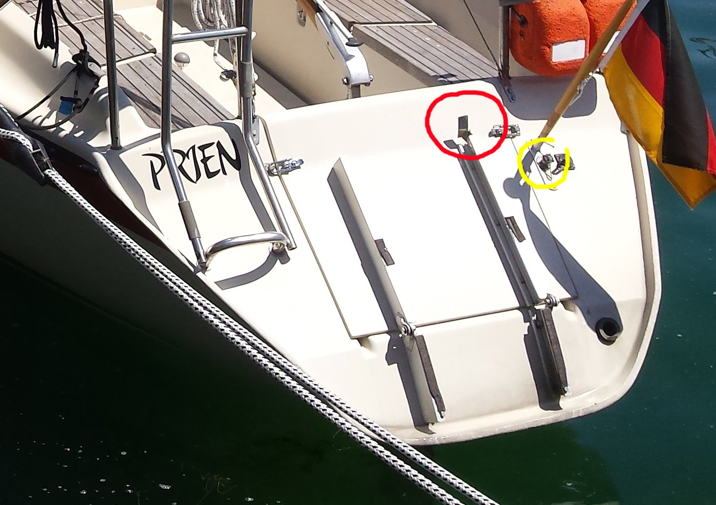 - Decksduchführungen: In der Nähe vom Mastfuß hat mutmaßlich der Vor-Vor-Vorbesitzer oder der Hersteller bereits Decksdurchführungen montiert, aber diese sind weder innen angeschlossen noch sind Leitungen im Mast weitergeführt. Siehe Bild 1. Die Decksdurchführungen sind auch nur außen sichtbar, nicht innen. Nach mehrfachem Nachmessen bin ich überzeugt, dass diese Decksdurchführungen innen innerhalb des Kastens für den Hubkiel enden. Durch das Inspektionsloch im Kielkastens kann ich aber nichts erkennen.