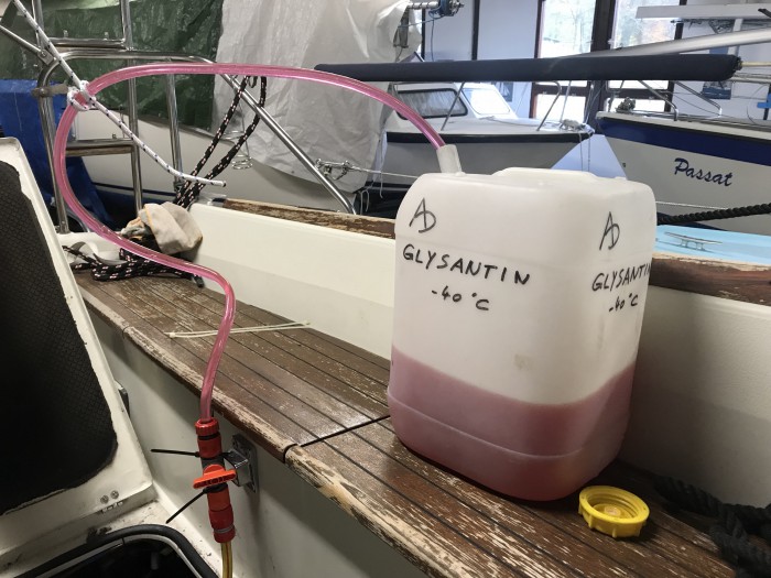 - Kanister mit Frostschutzmittel in der Kajüte etwa auf dem Niveau des Seewasserfilters aufstellen