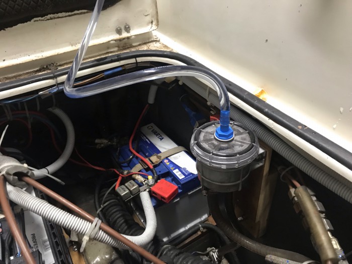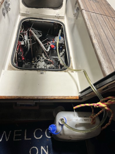 Das teuerste an dieser Lösung war der Kauf eines zweiten Deckels für den Seewasserfilter. Dafür habe ich aber meine Hände frei und es besteht keine Gefahr, daß Frostschutzmittel daneben läuft. Der Maschinenraum bleibt bei dieser Aktion trocken.