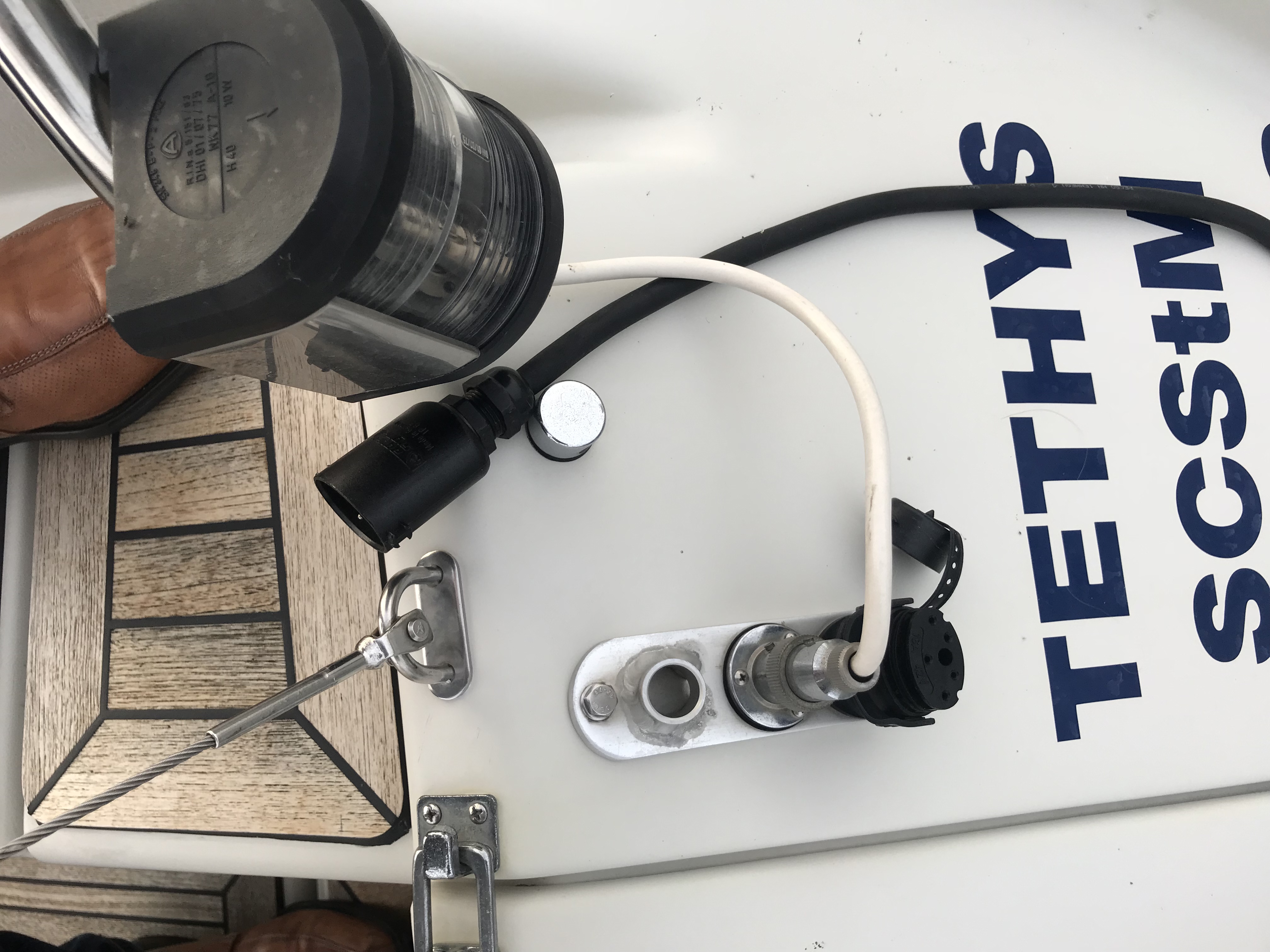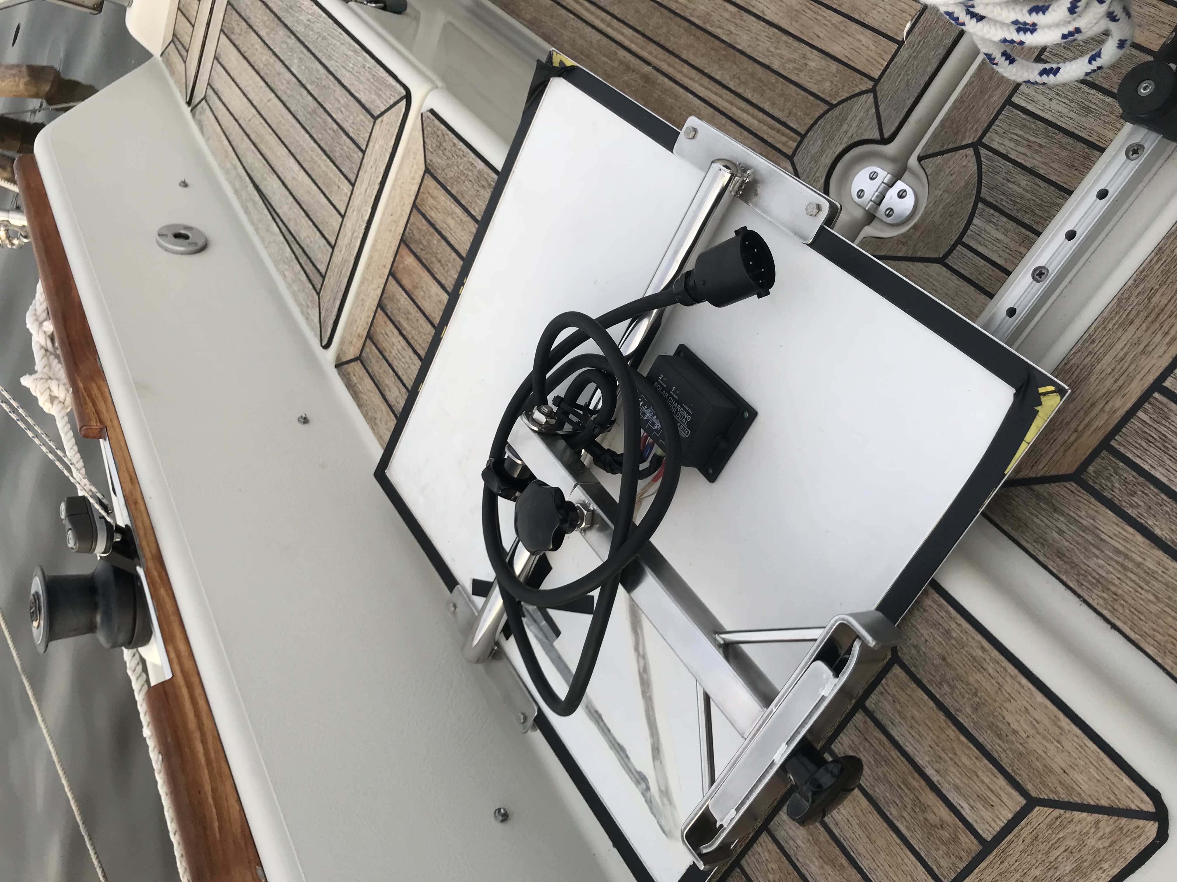 Mein Ansatz ist über dem Schiebeluk zu schweben - Kabelführung ist unter der Lucke durch ohne Bohrung aber mit Kabelbindern an der Schiene befestigt - die 2 Holzbretter sind auch an der Schiene befestigt - mal sehen wie lang es braucht bis bei Seegang da mal jemand drauf tritt: