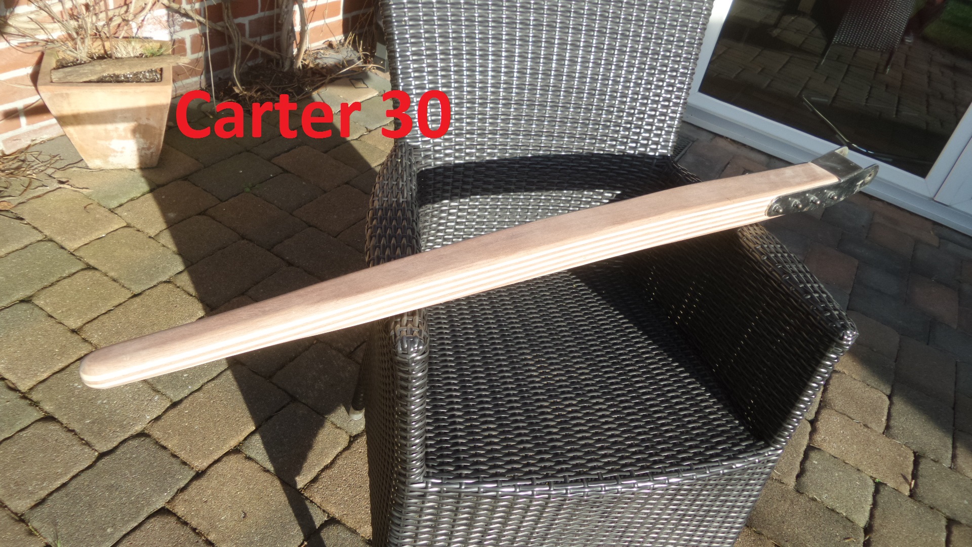Ich habe also einen Pinnenausleger aus Mahagoni und Eschestarkfurnieren lamelliert und mit einer Holzkugel als Griff versehen (Durchmesser der Holzkugel 5 cm)