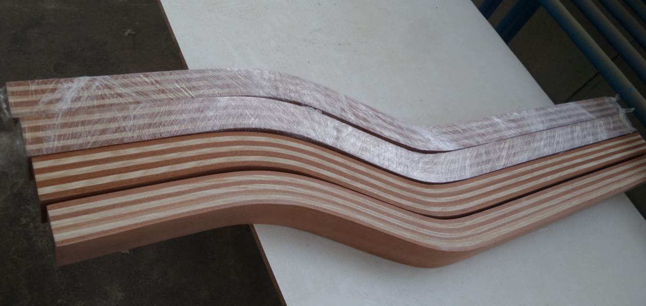 Das Rohmaterial war ursprünglich 495 x 36 cm (Mahagoni) und 385 x 16 cm (Esche) lang.