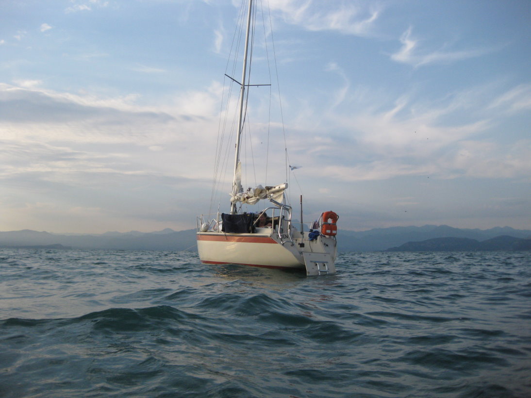 Im Hafen in Lazise hätten wir einkranen können, allerdings wurde nach unserem Zeltplatz gefragt. Zeltplatz? Wir wollen doch im Boot schlafen und an Gastliegeplätzen übernachten. Gastliegeplätze gibt es am ganzen Gardasee keine, war die Antwort. Wir wurden nach Pischiera geschickt, da gibt es eine große private Marina Pioppi. Also mit dem Gespann nach Pischiera. Dort konnten wir die Woche liegen, 40 €/Nacht, exkl. Strom, Wasser und Duschen. Aber eigekrant wurde dort erst am nächsten Tag. Also haben wir auf einem Campingplatz auf dem Boot auf Trailer übernachtet (Originalidee von Dehler). In dieser Nacht ist ein heftiges Gewitter aufgezogen, was ganze Äste der Pinien runtergerissen hat.