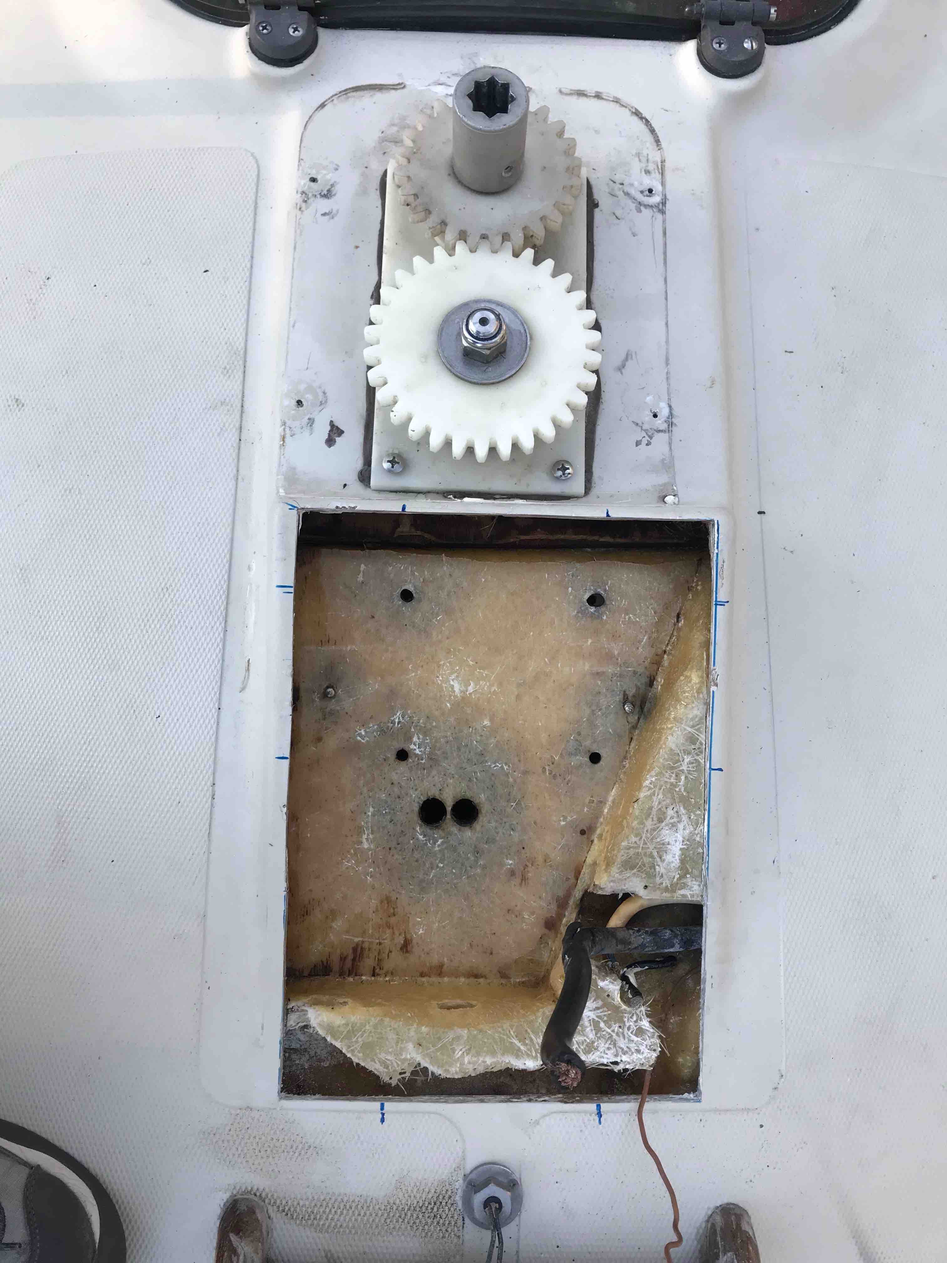 Anhand der 4 Löcher zum fixieren des Mastkokers im Laminat und der beiden etwas weiter außen liegenden Schrauben, die den Kielkasten von unten mit dem Deck verbinden, kann ich erkennen, dass der Mastkoker nicht direkt auf der Randfläche des Kielkastens aufliegt, sondern quasi nur über dem Hohlraum des Kielkastens sitzt. Das heißt, die auftretenden Kräfte gehen vom Mastkoker in den neu aufgebauten Kern des Mastfusses um dort seitlich vom Kielkasten aufgenommen zu werden.