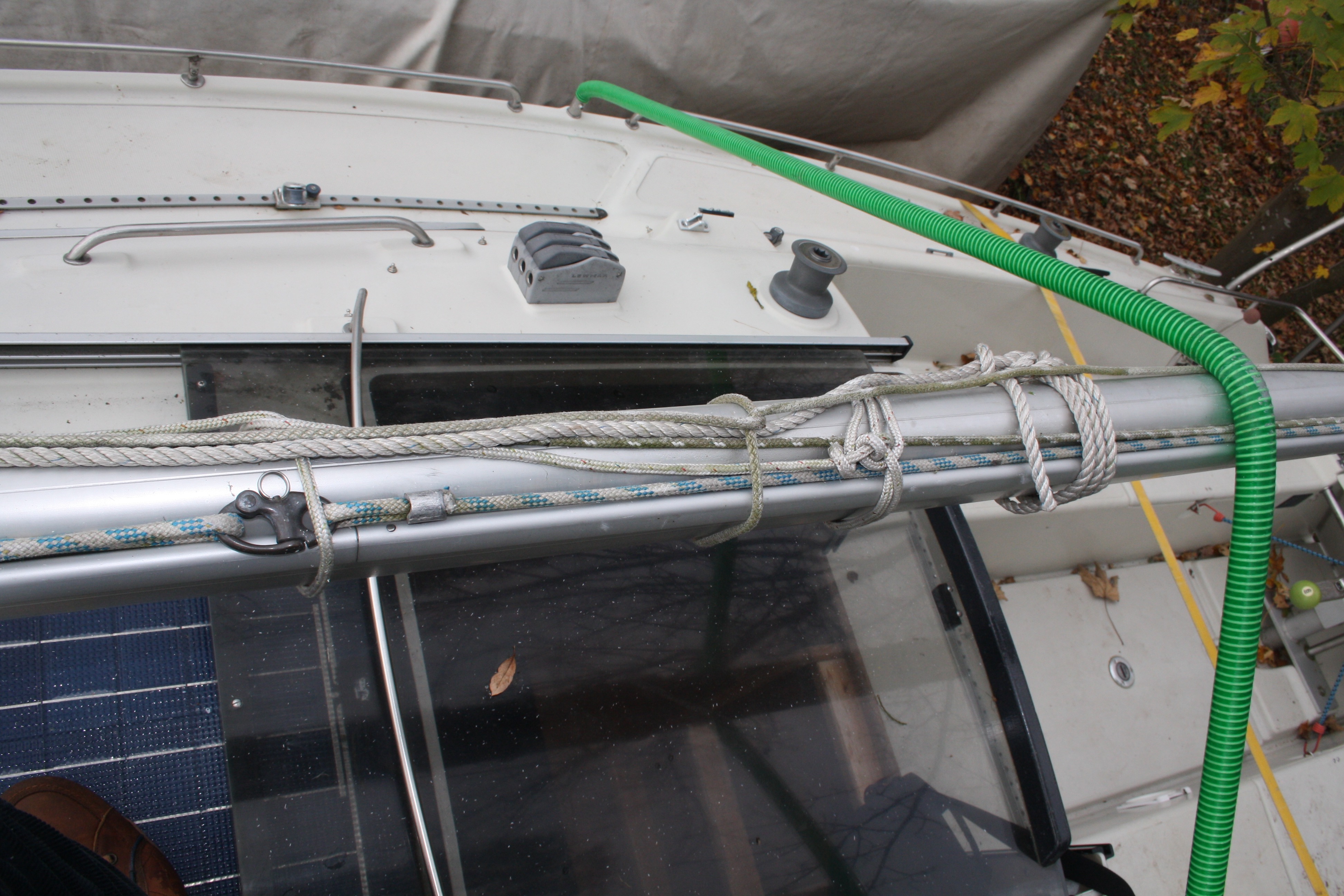 Der Vorbesitzer hat auch eine clevere Lösung für die Unterstützung der Plane gebastelt: Plastikrohre, mit einer Hülse an den Rehlingsaufnahmen, bzw der Hilfswantenaufnahme über den gelegten Mast gespannt.