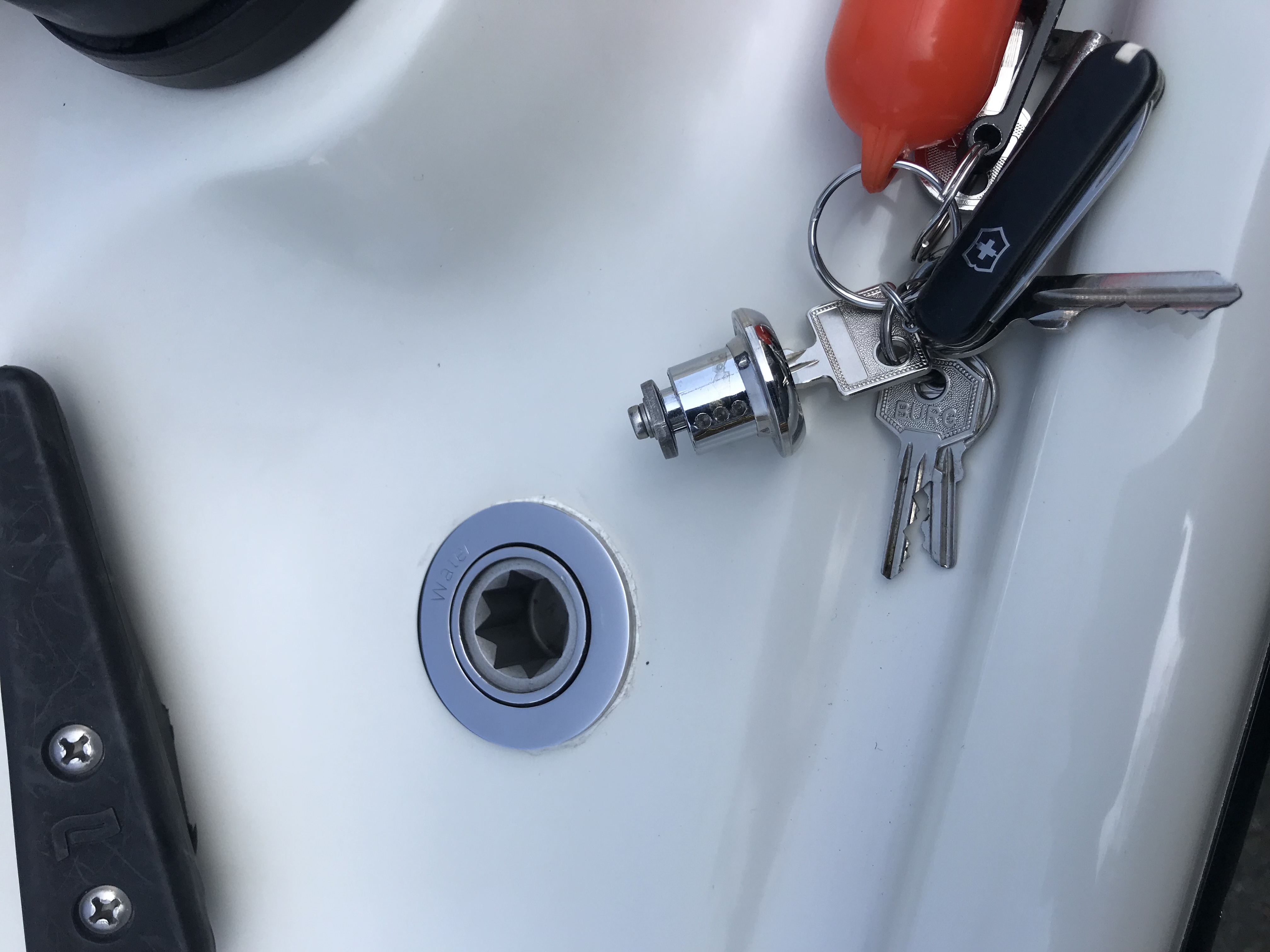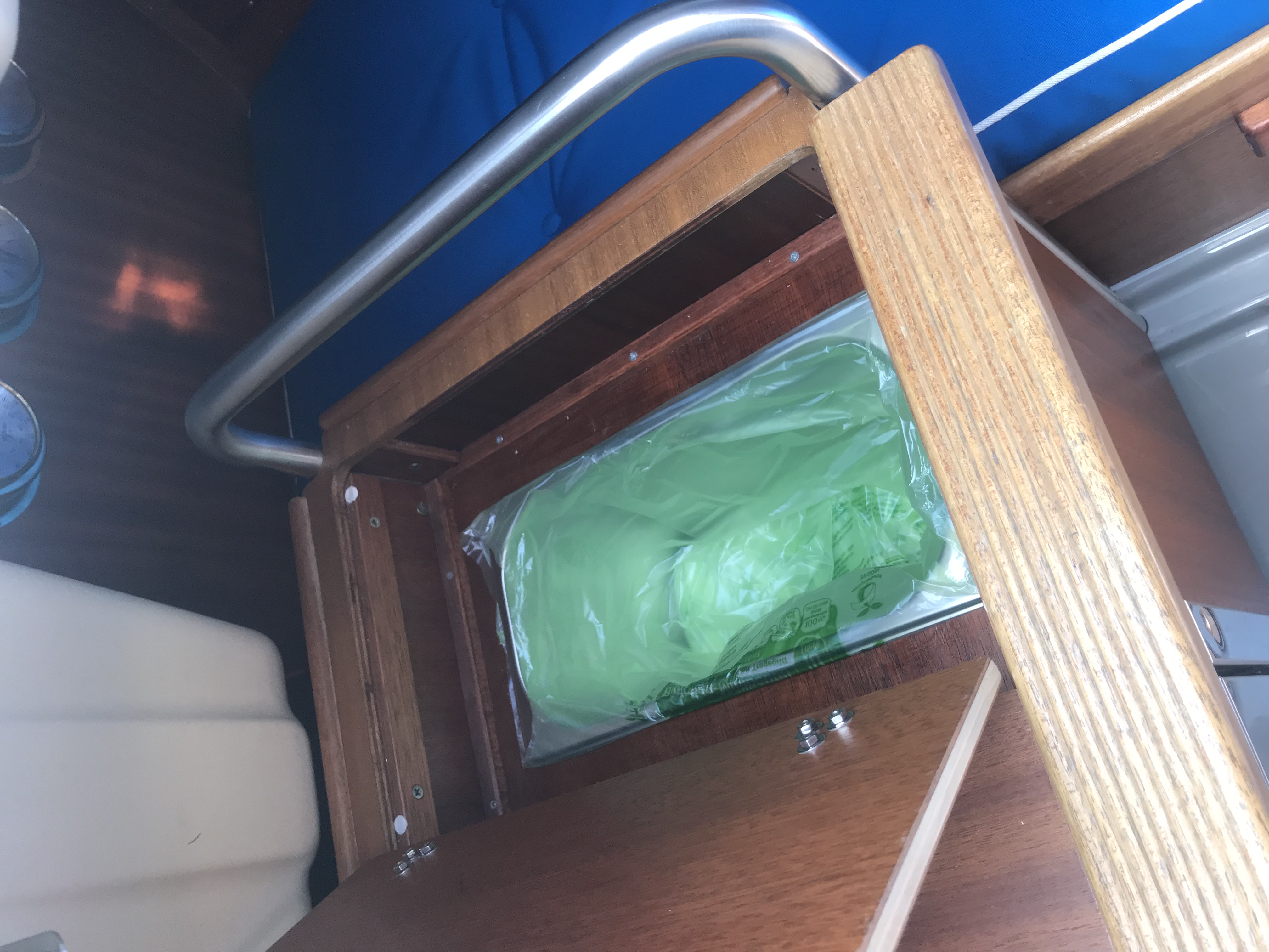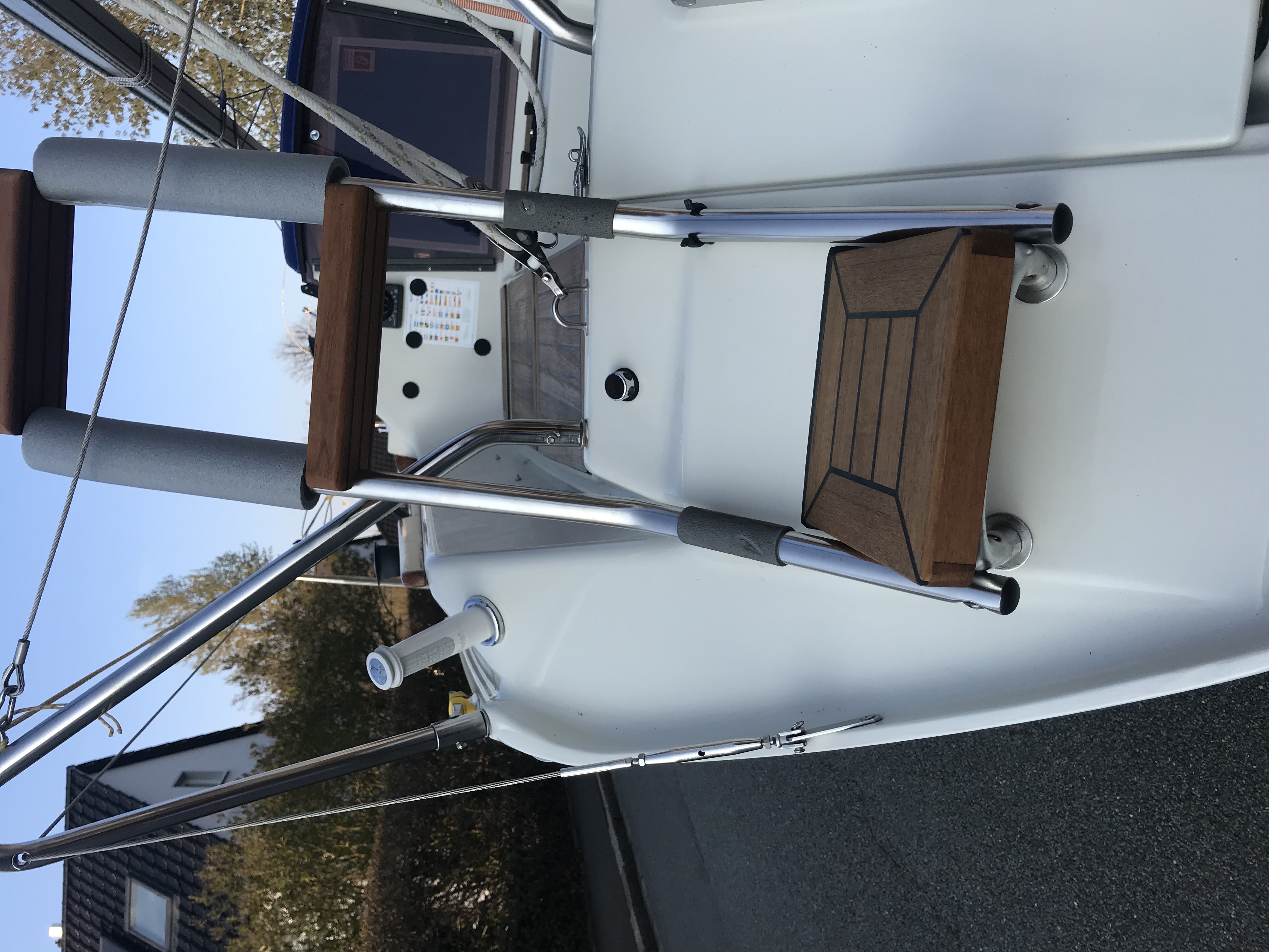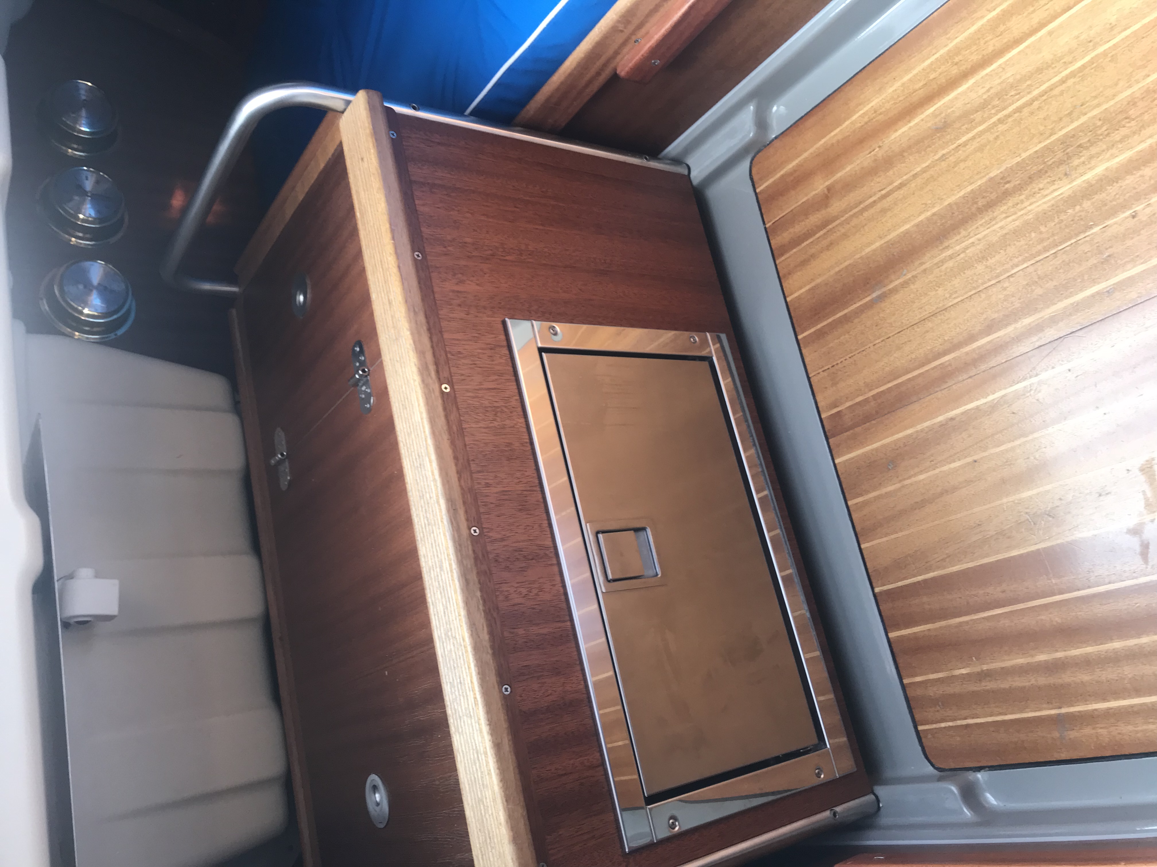 Waschbecken, Abwasserkanister und Frischwasserkanister ( ohnehin alles eher spielzeughaft dimensioniert ) raus aus dem serienmäßigen Pantryblock, stattdessen wurden dort ein Kompressorkühlfach und ein INOX - Mülleimer mit Deckel, installiert , vorne unter den Vorschiffskojen liegt jetzt ein flexibler 120 l Tank von Plastimo, steuerbord im hinteren Bereich des Laufdecks wurde der Trinkwassereinfüllstutzen und am Heck auf der backbordseite wurde die Duscharmatur platziert.