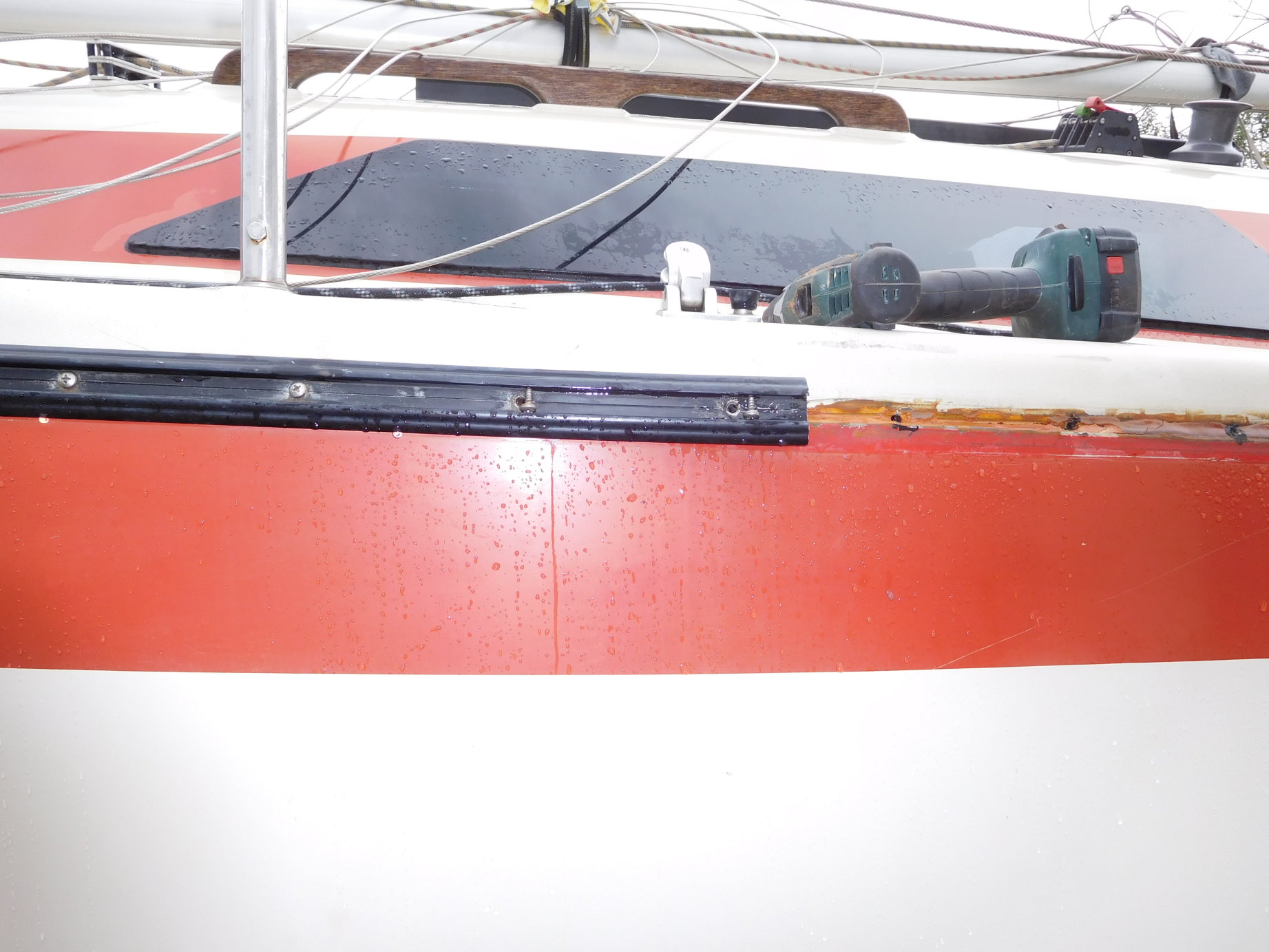 Heute brauche ich bitte mal Euren Rat. An unserer Dehlya 25 (Baujahr 1989) hat sich die Scheuerleiste auf Steuerbord abgelöst. Etwa in Bootsmitte hat die Scheuerleiste zum Rumpf einen Spalt. Ich vermute, daß dort Schrauben ausgerissen sind.