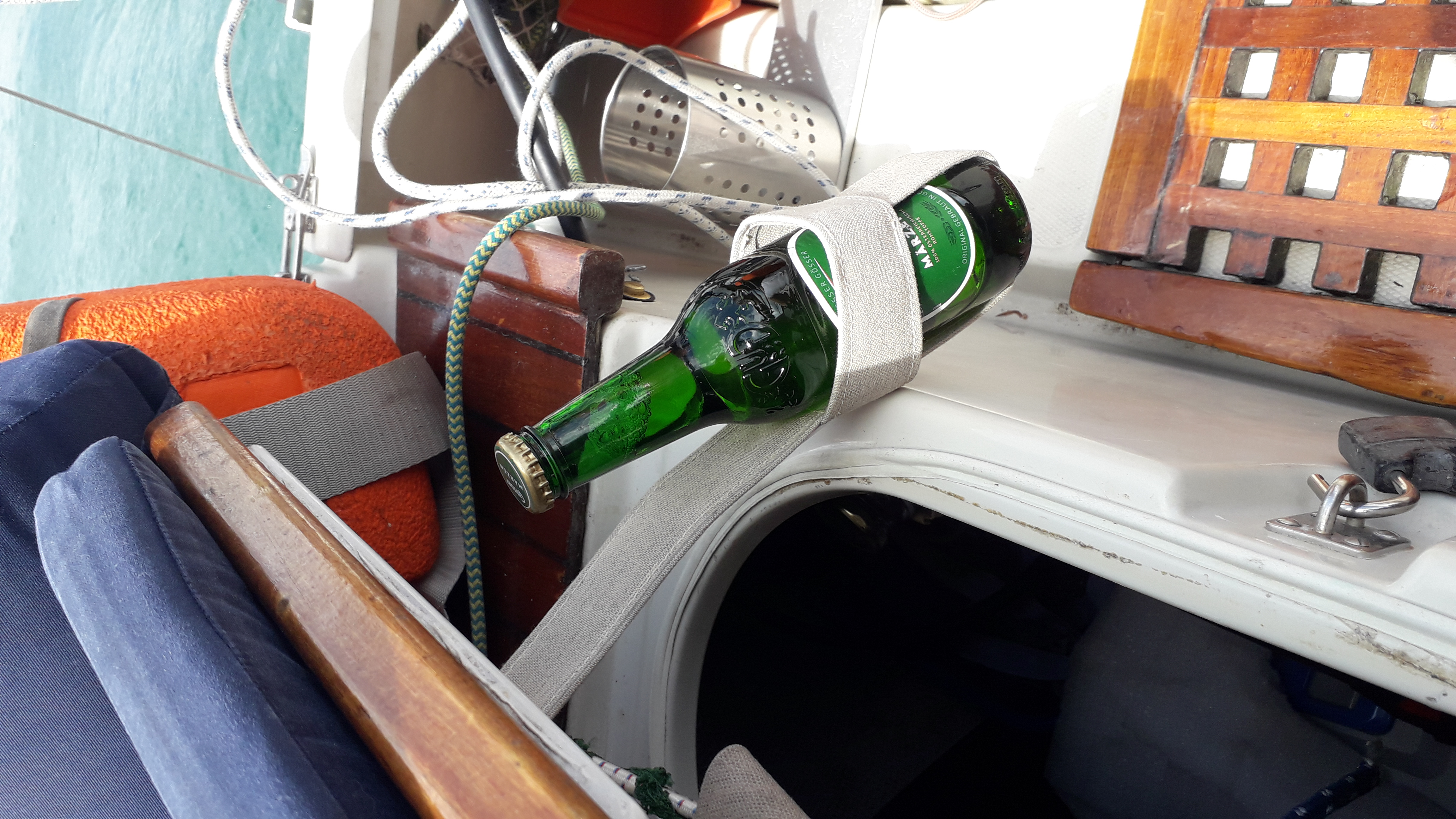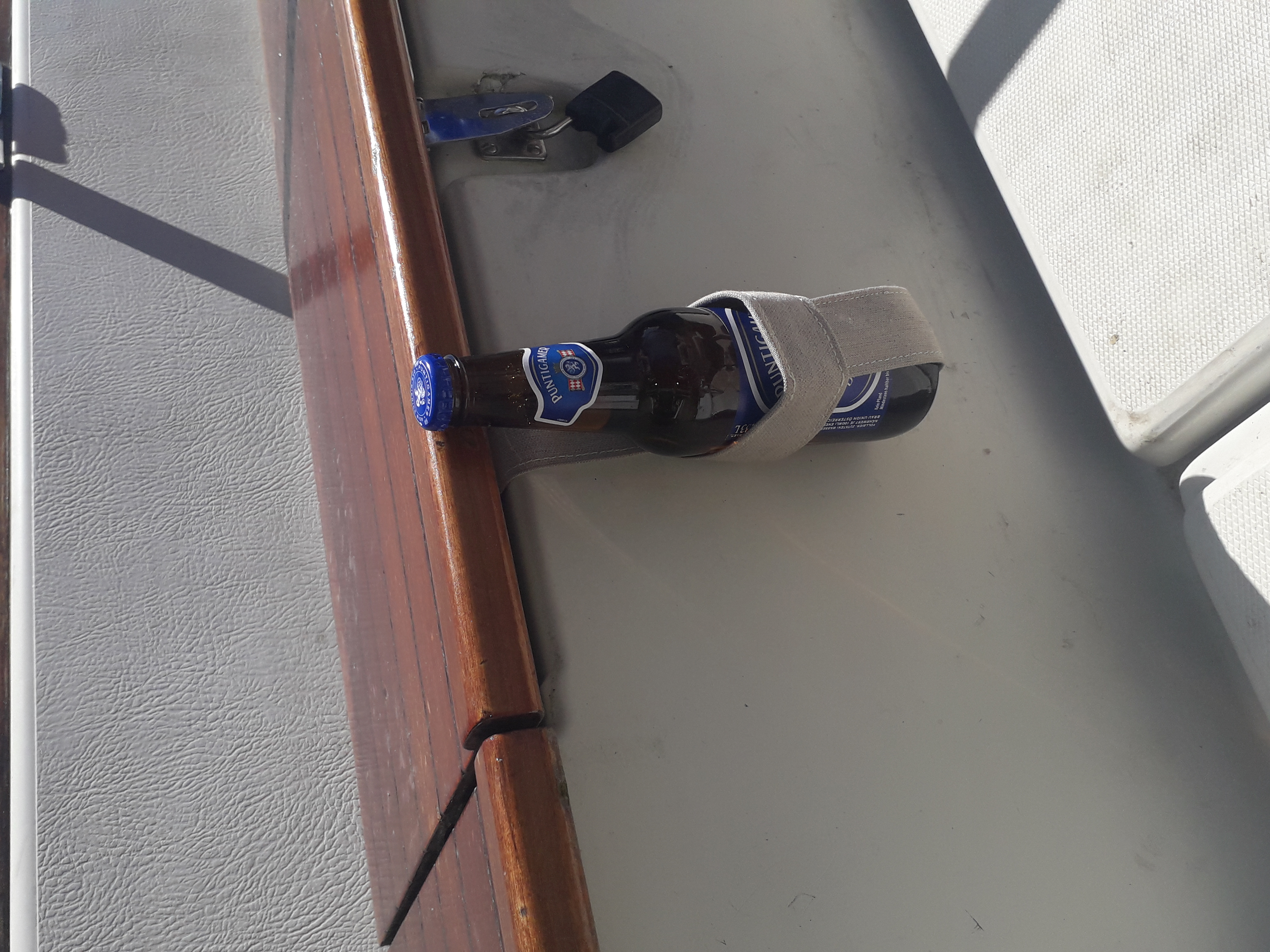 So, die Getränkehalter haben sich auch beim Segeln gut bewährt! Ich habe nur noch auf der Rückseite provisorisch ein Linealstück aufgeklebt, damit das Gurtband steifer wird und nicht mehr pendelt.