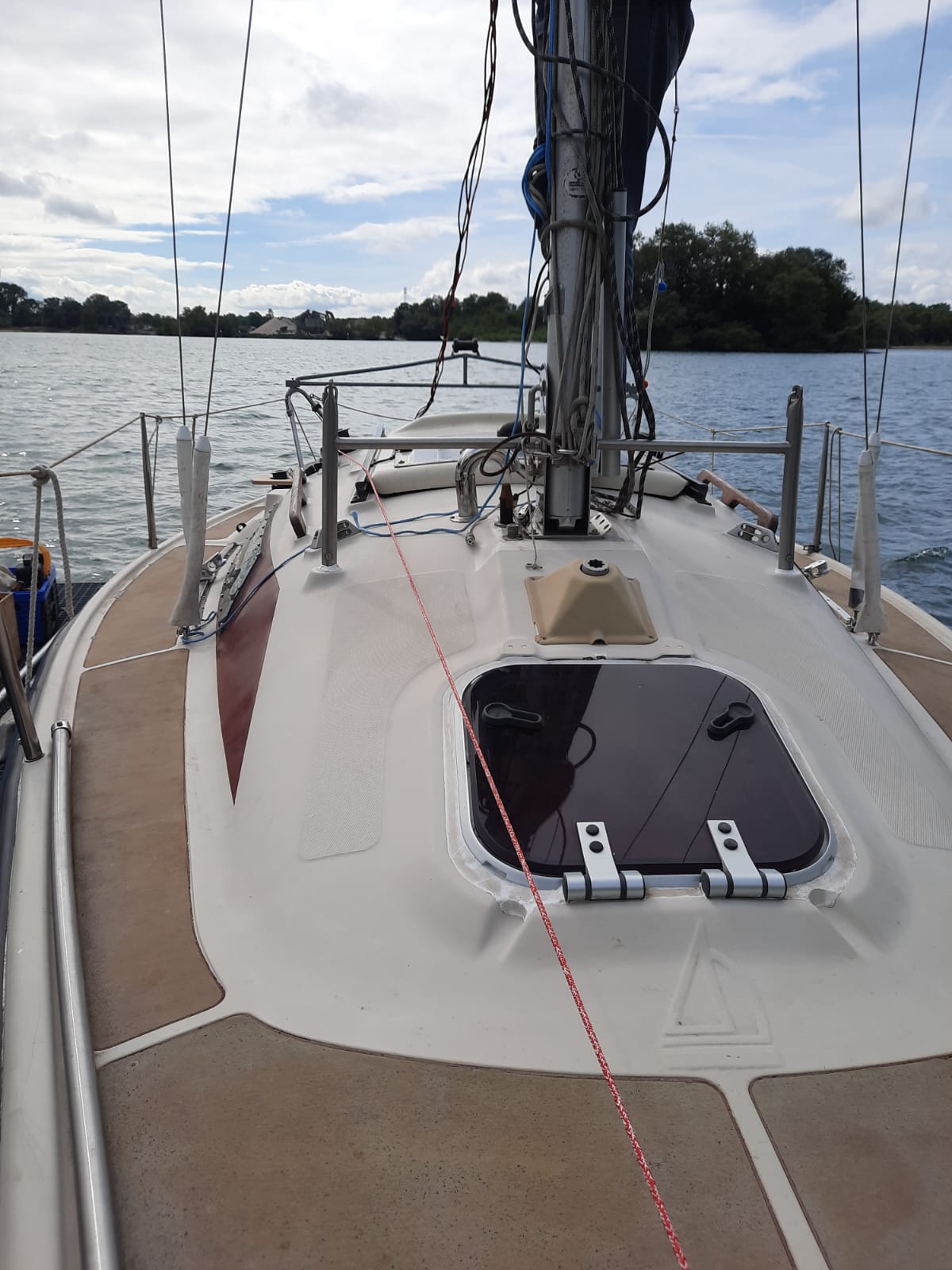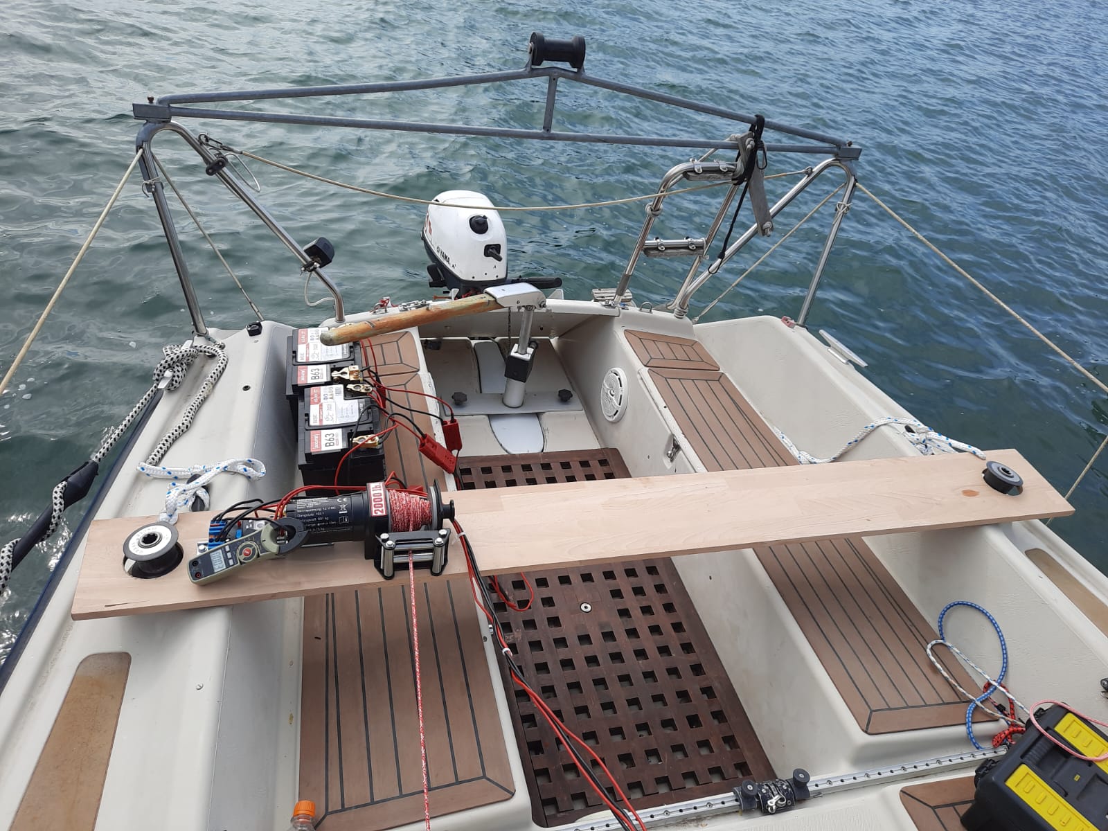 Danke für eure Antworten. Im Herbst werde ich die 5mm Dyneema-Leine nochmals verwenden, dann wechsle ich auf 5mm Stahlseil. Das vorgebaute Windenfester hat viel gebracht, im ersten Versuch ohne Windenfester wickelte sich die Leine alles andere als gleichmäßig auf die Winde. Die Fernbedienung möchte ich nicht mehr missen, damit hat man echt Aktionsradius. Möglicherweise lässt sich der wesentliche Teil der Anordnung vom Brett auch im Ankerkasten unterbringen, so wie es Detlev hat bei seiner 25er. Aktuell macht mir das Brett keine Sorgen, eine rückseitige Metallverstärkung hab ich auch schon in Betracht gezogen....