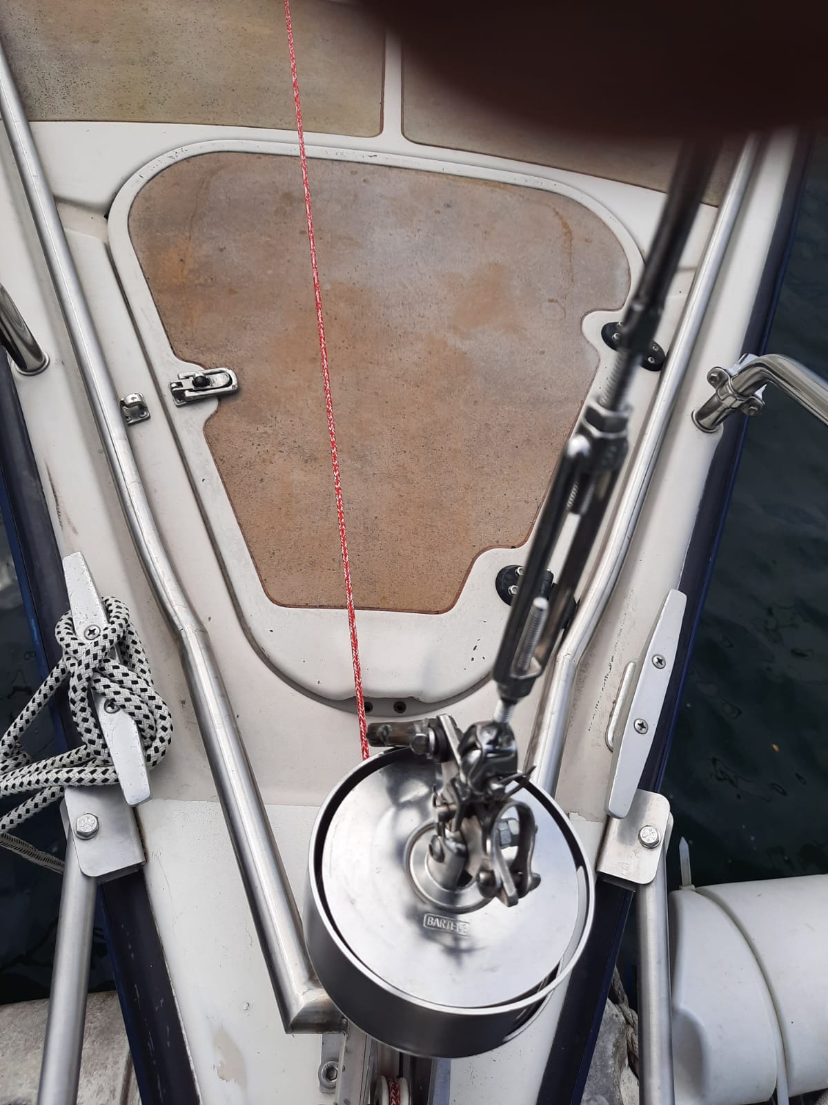Anschliessend demontiere die nicht selbstholende 6er Lewmarwinsch , verschliesse die Löcher mit ein wenig angedicktem Epoxid und montiere die 16er selbstholende Winsch. .....und ja, es sind neue Bohrungen zur Montage fällig, dass sollte aber kein Problem sein. Die unter der Serienwinsch einlaminierte Aluplatte ist gross genug um auch die Bohrungen für eine 16er Winsch aufzunehmen.