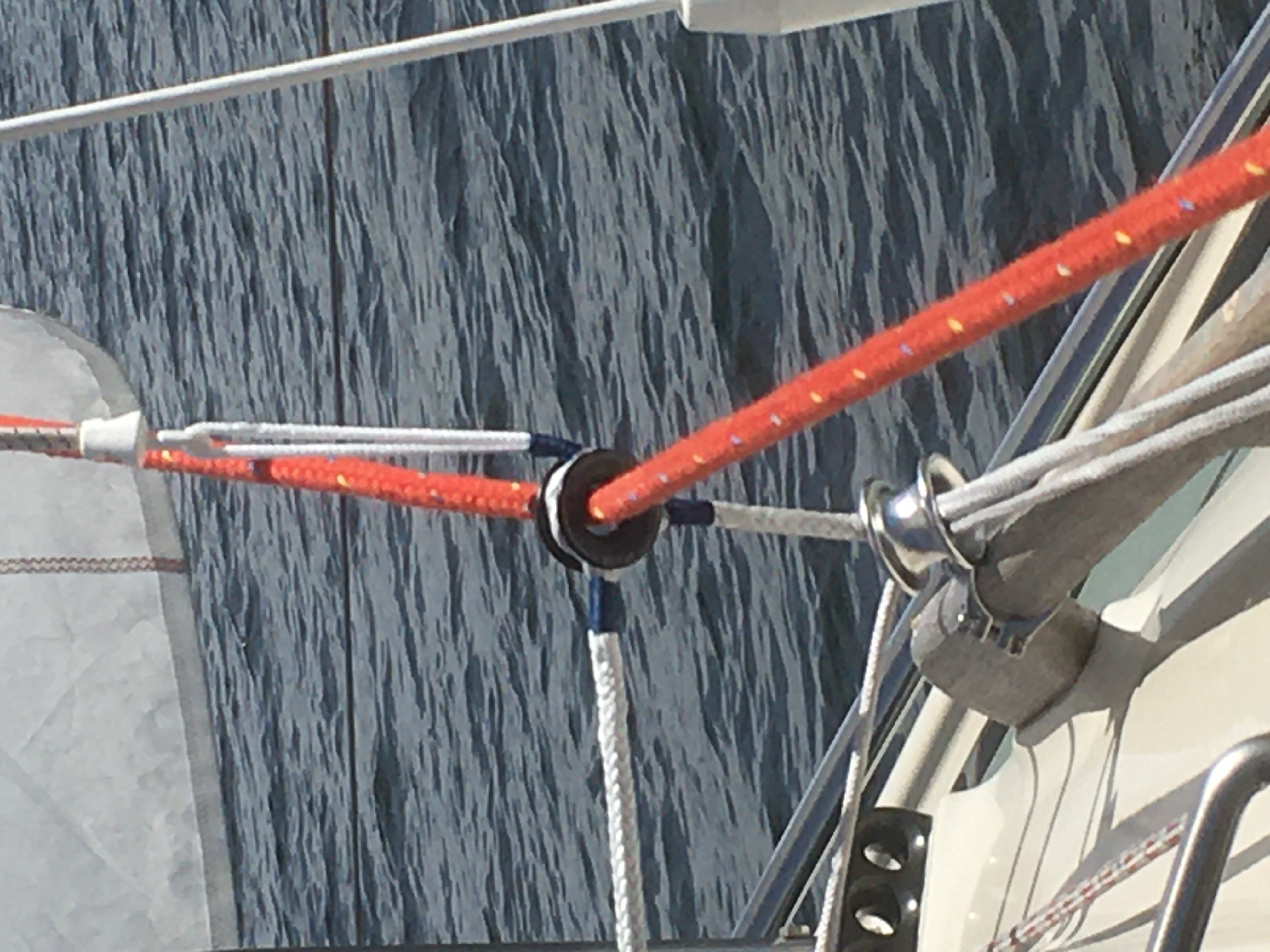 Dort kommen Leinen durch, an deren Ende ich Highloadaugen eingespleisst habe, zusammen mit einem Barberhauler, der das Auge mittschiffs ziehen kann und einem kleinen Loop, den ich an ein Gummi hänge, das am Want fest ist und verhindert, dass das Luv-Auge aufs Kajütdach fällt.