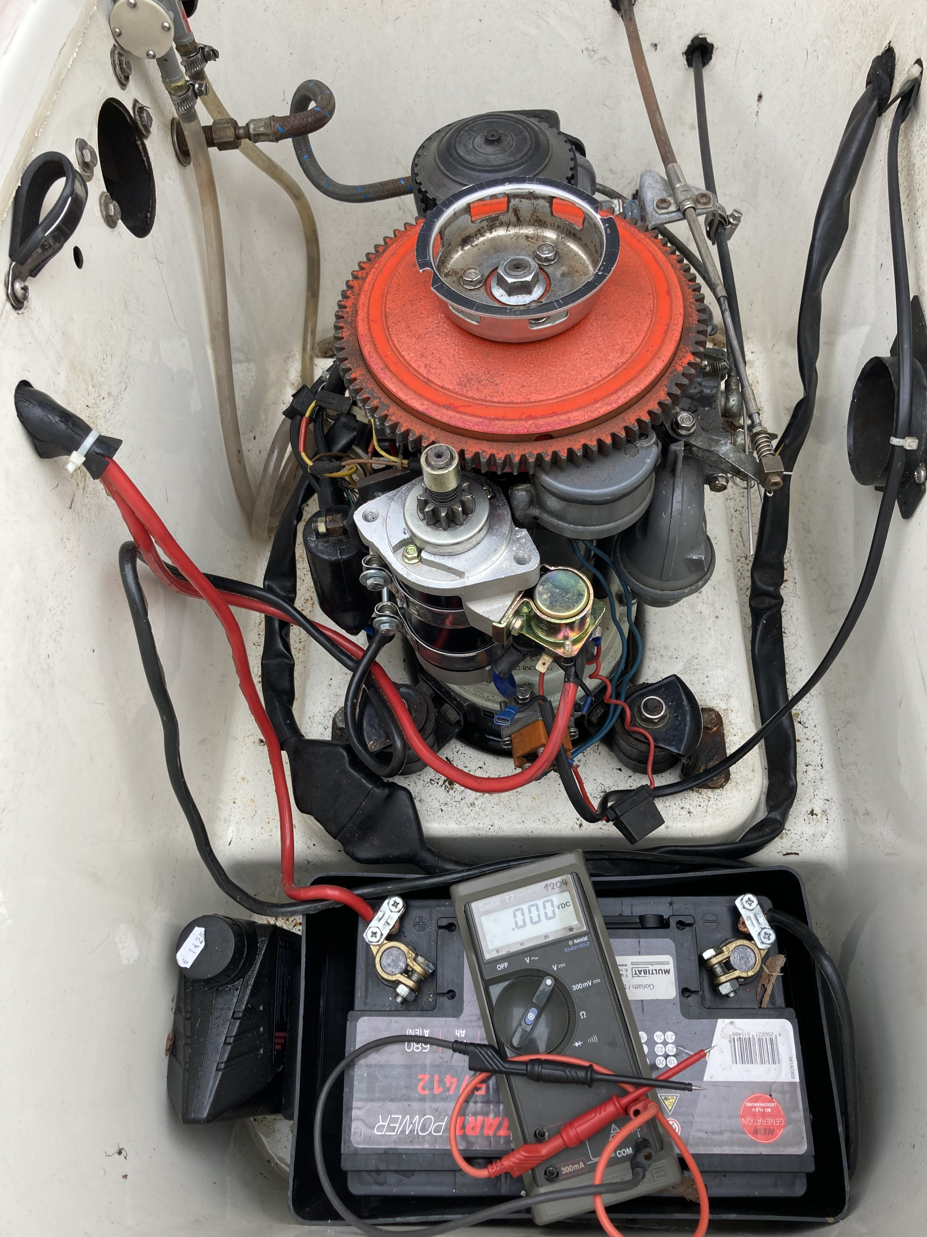 Ich habe einen neuen Anlasser eingebaut. Die Elektrik scheint okay. Die Zündkerzen geben wechselnd Zündfunken. Sie sind auch nicht zu feucht.