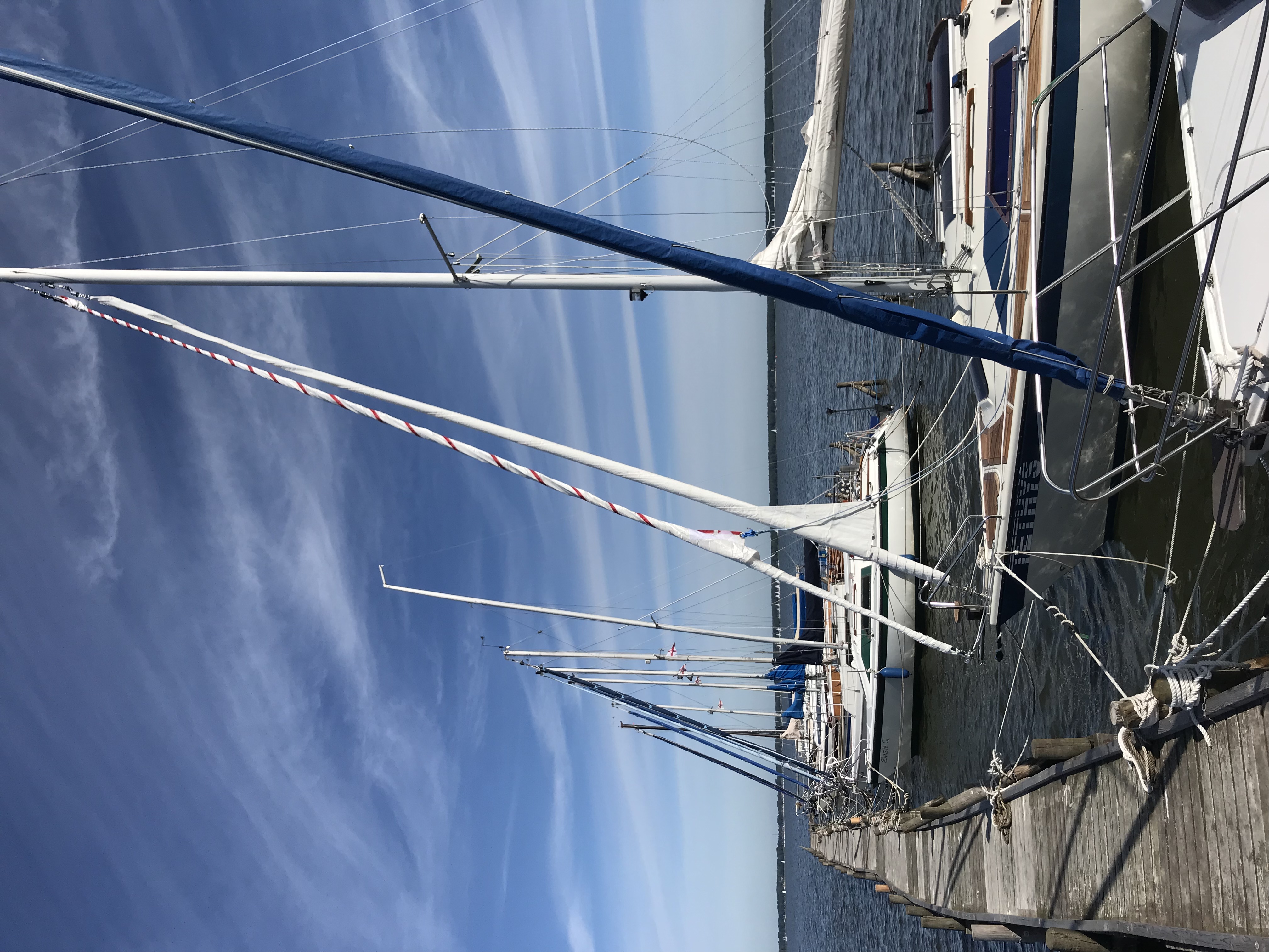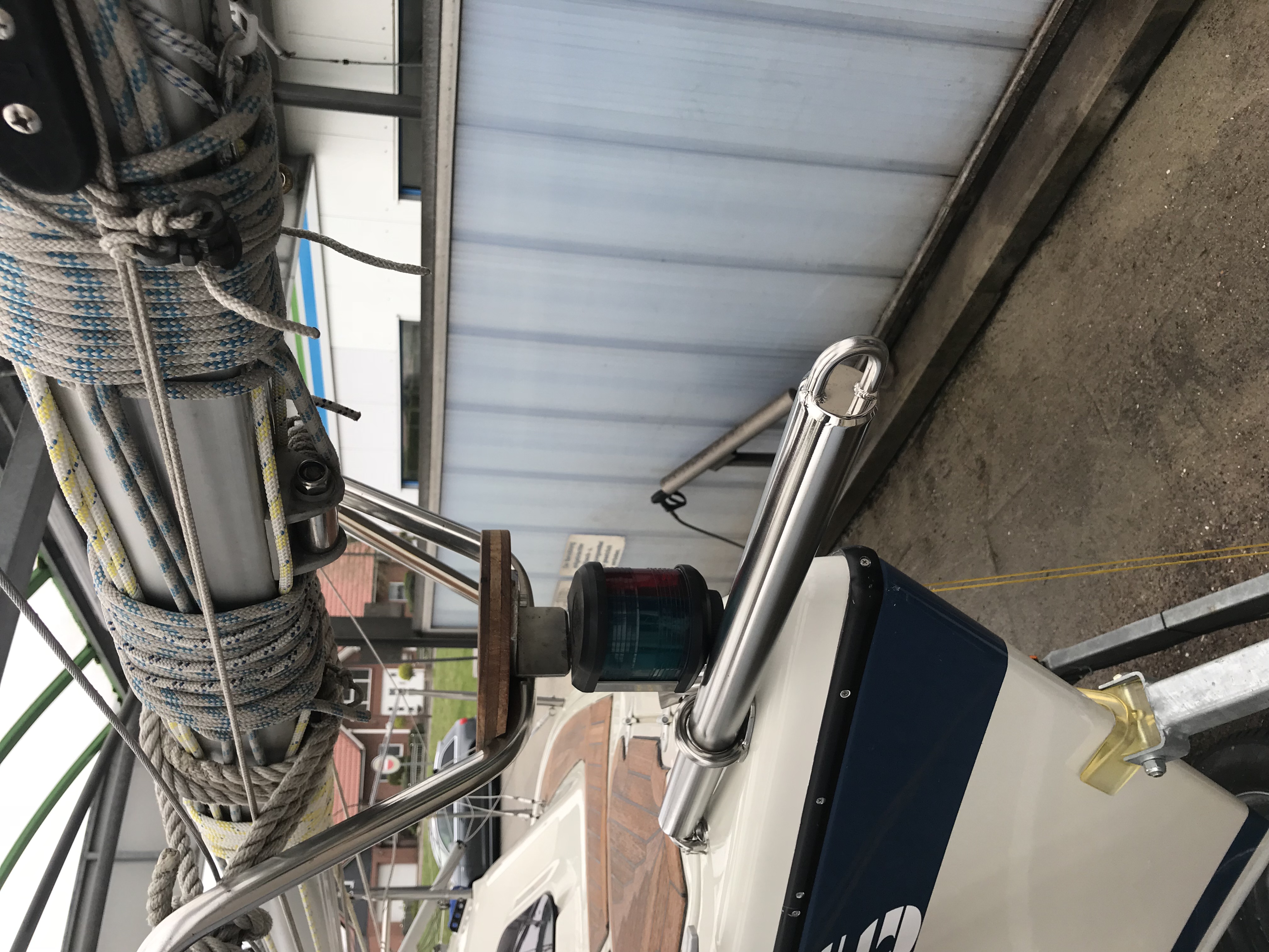 ... bisher habe ich die Endlosleine für den Furler des Furlström - Segels “ frei fliegend “ gefahren , hat mir aber doch nicht so gut gefallen, fand daß zu viel Wuhling auf dem Backbord - Laufdeck war ; auf der Steuerbordseite wird ja über Führungsösen an den Relingsstützen die Reffleine für die Topreffanlage nach vorne zum Bug geführt , auf der Backbordseite habe ich jetzt etwas Ähnliches für die Endloleine des Furlers ersonnen. Man braucht halt 2 Führungsösen pro Reelingsstütze und die müssen dann halt oben offen sein damit man die furlerleine hineindrücken kann , funktioniert bei mir jetzt einwandfrei und jetzt ist auch das Backbordlaufdeck schön aufgeräumt und weil kaum noch Gefahr besteht, daß jemand auf die Furlerleine tritt, ist auch die Sicherheit verbessert !