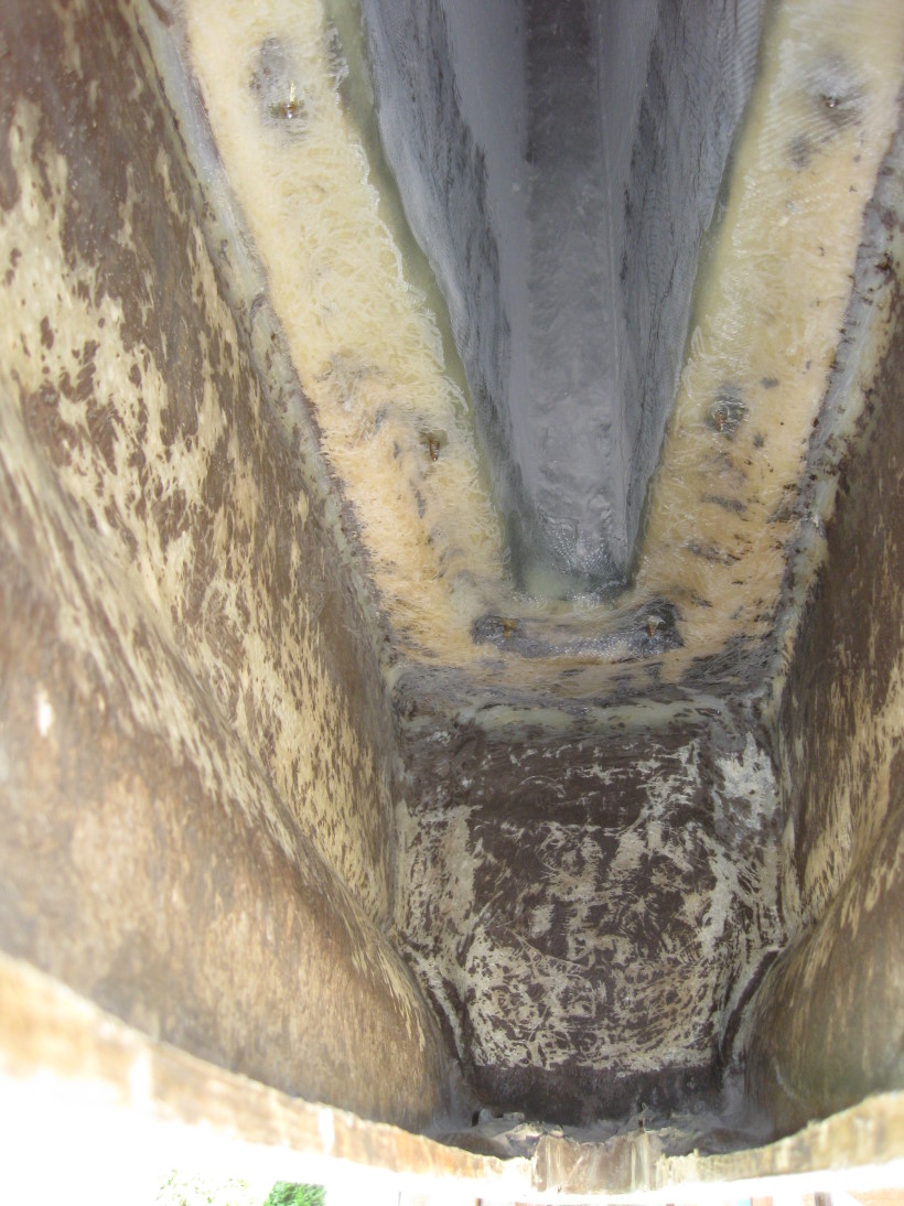 Dies sind 2 Fotos in den Ballasttank vom Loch, wo das Ballastventil montiert war. Dies stammt noch von der Zeit vor der Sanierung. Im Vordergrund ist ein kleiner Sandhaufen zu sehen, da muss der Voreigner wohl mal trockengefallen sein. Es ist aber deutlich zu sehen, dass die stumpfen Anschlüsse des Schotts komplett undicht waren, da sie noch nass waren, also Feuchtigkeit aufgenommen haben.