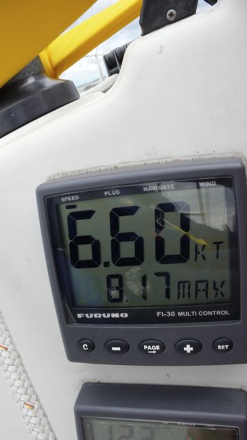 7,8 kt - Raumschotskurs/Vorwindkurs, nur Groß mit 1. Reff, Wind um 6 Bft, auf Wellen gut abgesurft.