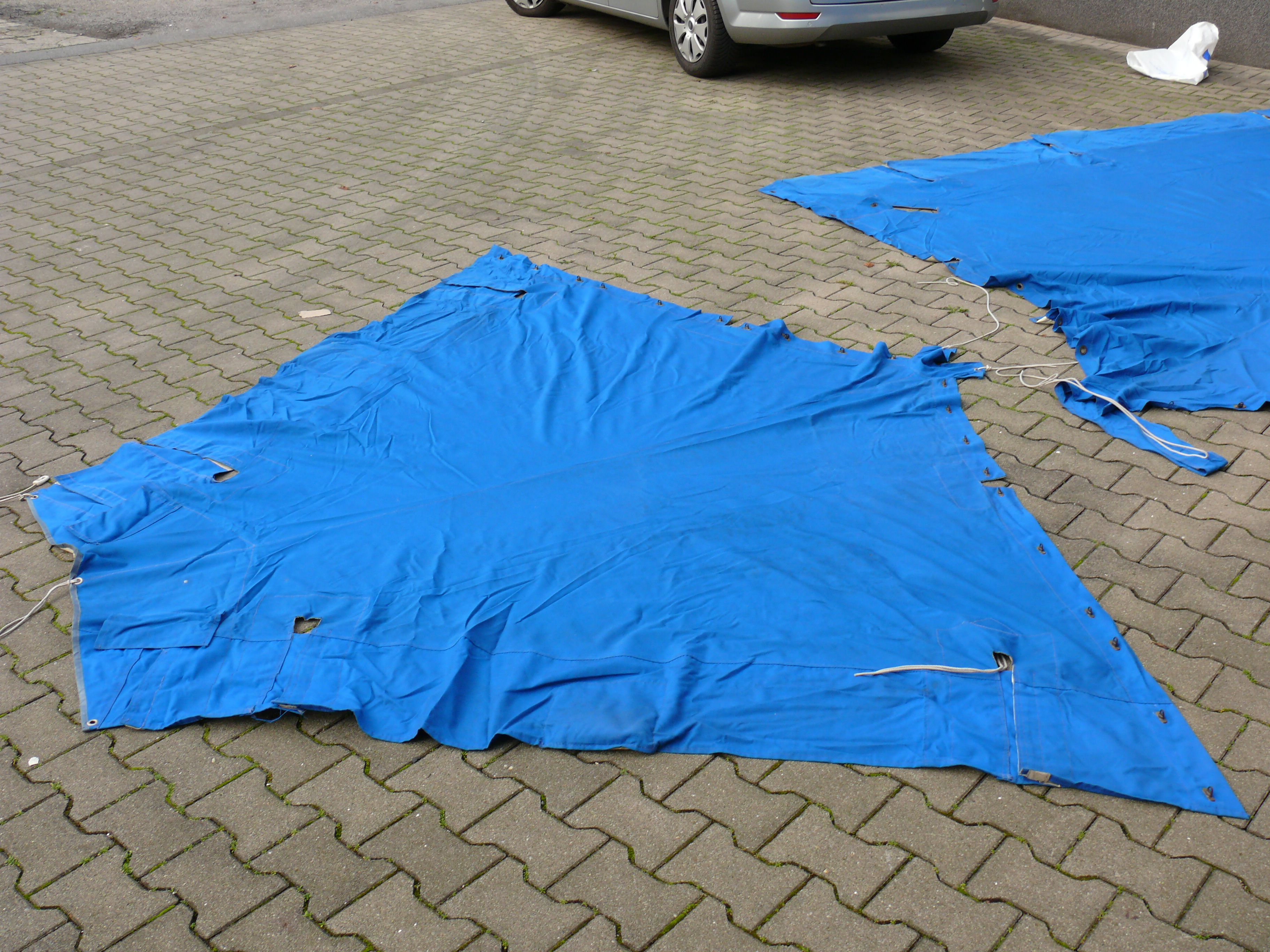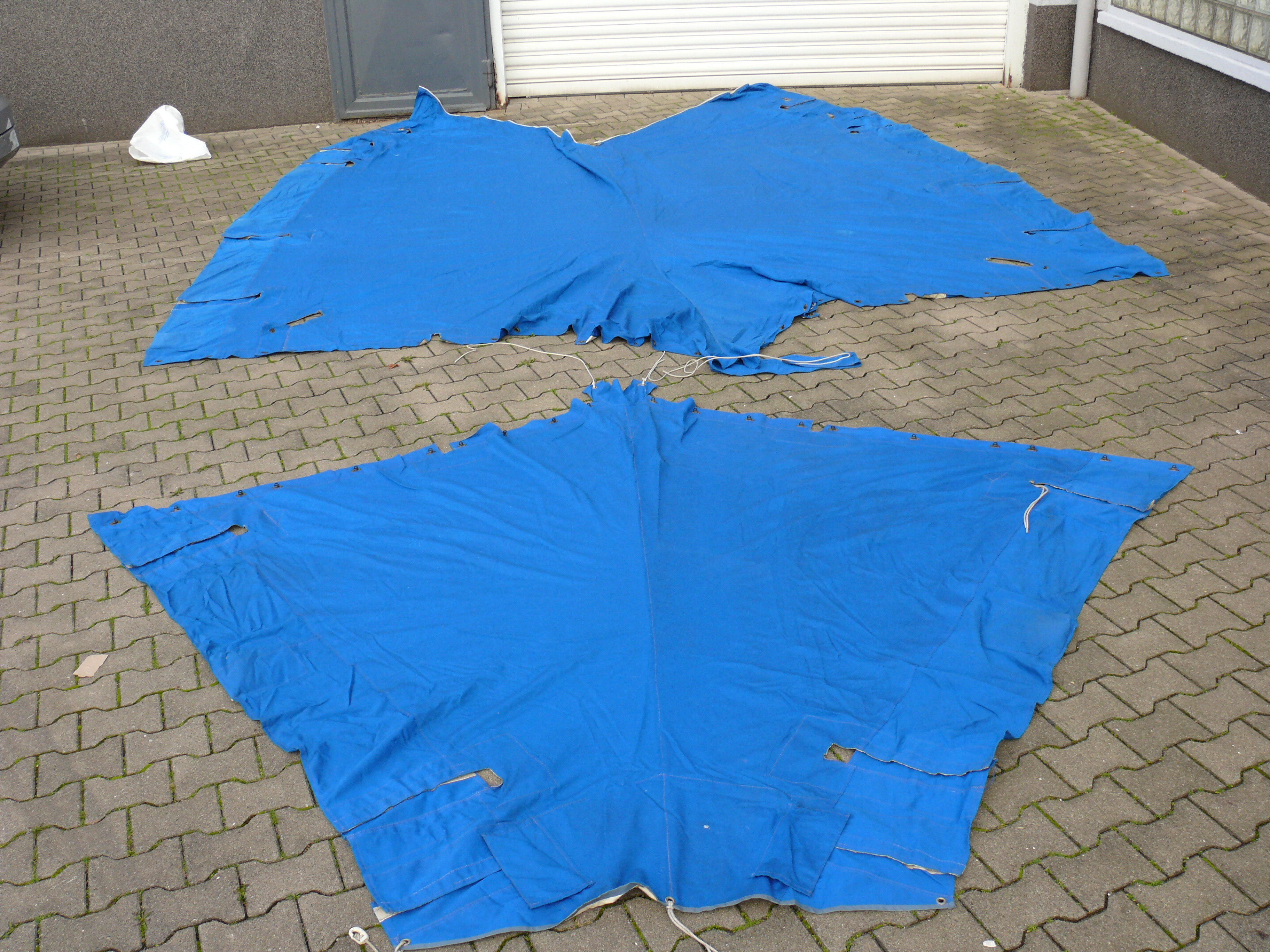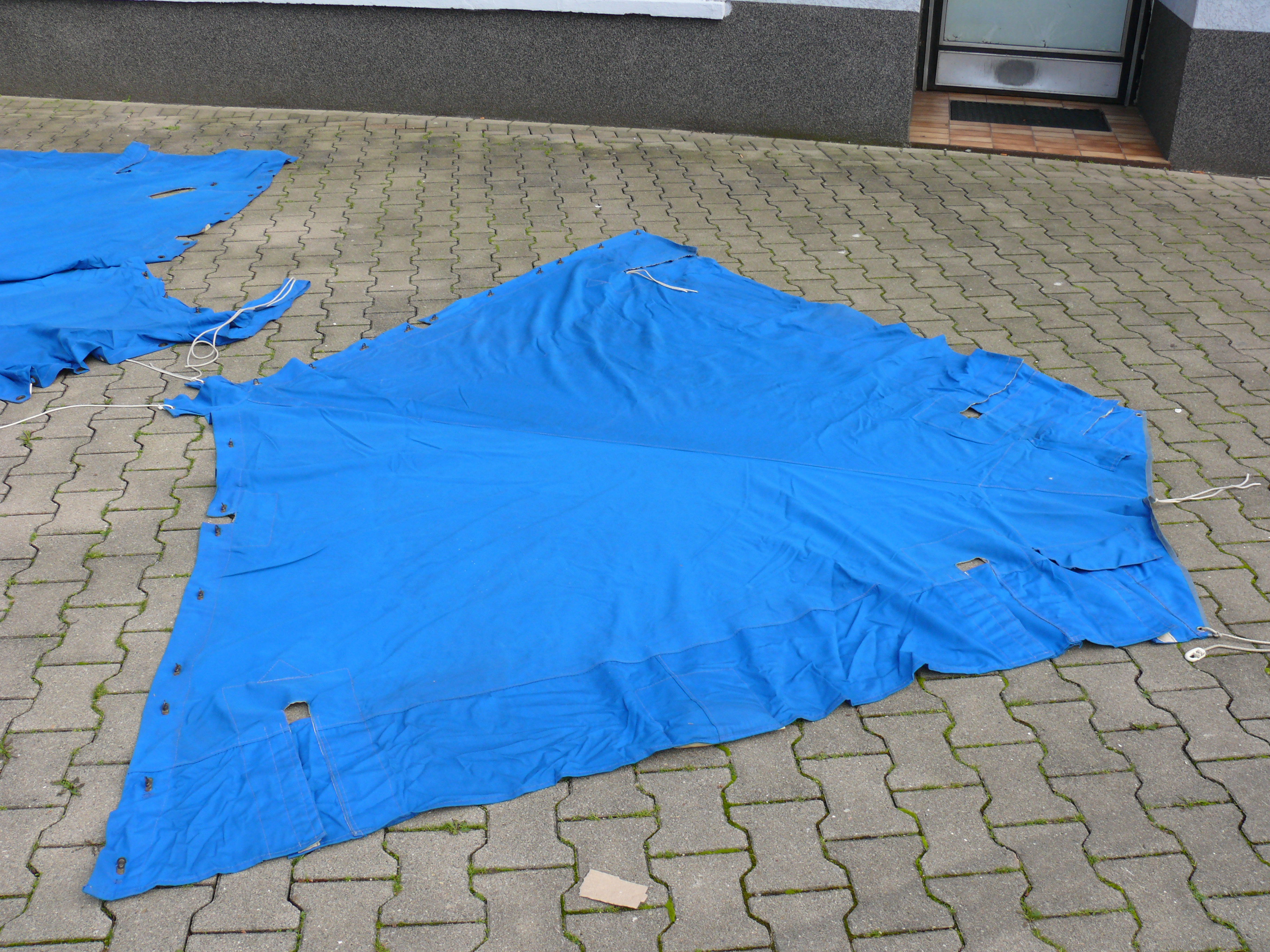 Das Teil hat keinen Grünspan und keine Stockflecken, die Persenning wurde jedes Jahr von mir frisch imprägniert und mit einem Grünspanverhinderer eingesprüht, mit gutem Erfolg. Ansonsten die typischen Nutzungserscheinungen, ein paar Nähte könnten mal nachgenäht werden, ist aber auch noch nicht wirklich nötig. Eine kleine Scheuerstelle durch den Sprayhoodbügel, kann durch einen kleinen Flicken schnell repariert werden. Ich denke, dass, was eventuell repariert werden muss, wird jeder Segelmacher für ca € 50,. erledigen.