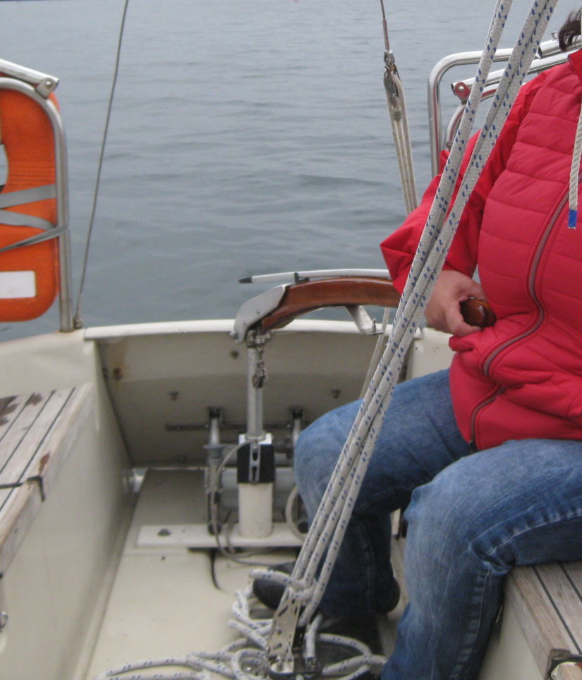 bei unseren Dehlyas haben wir den Vorteil, dass die Pinnenaufnahme in der Höhe mit der Schraube verstellt werden kann. Deshalb kann man bei einer einfach gebogenen Pinne auch ganz hinten sitzen und man bekommt trotzdem die Beine darunter. Die Pinnenverlängerung passt auch wunderbar drauf, ohne dass sie irgendwo übersteht.