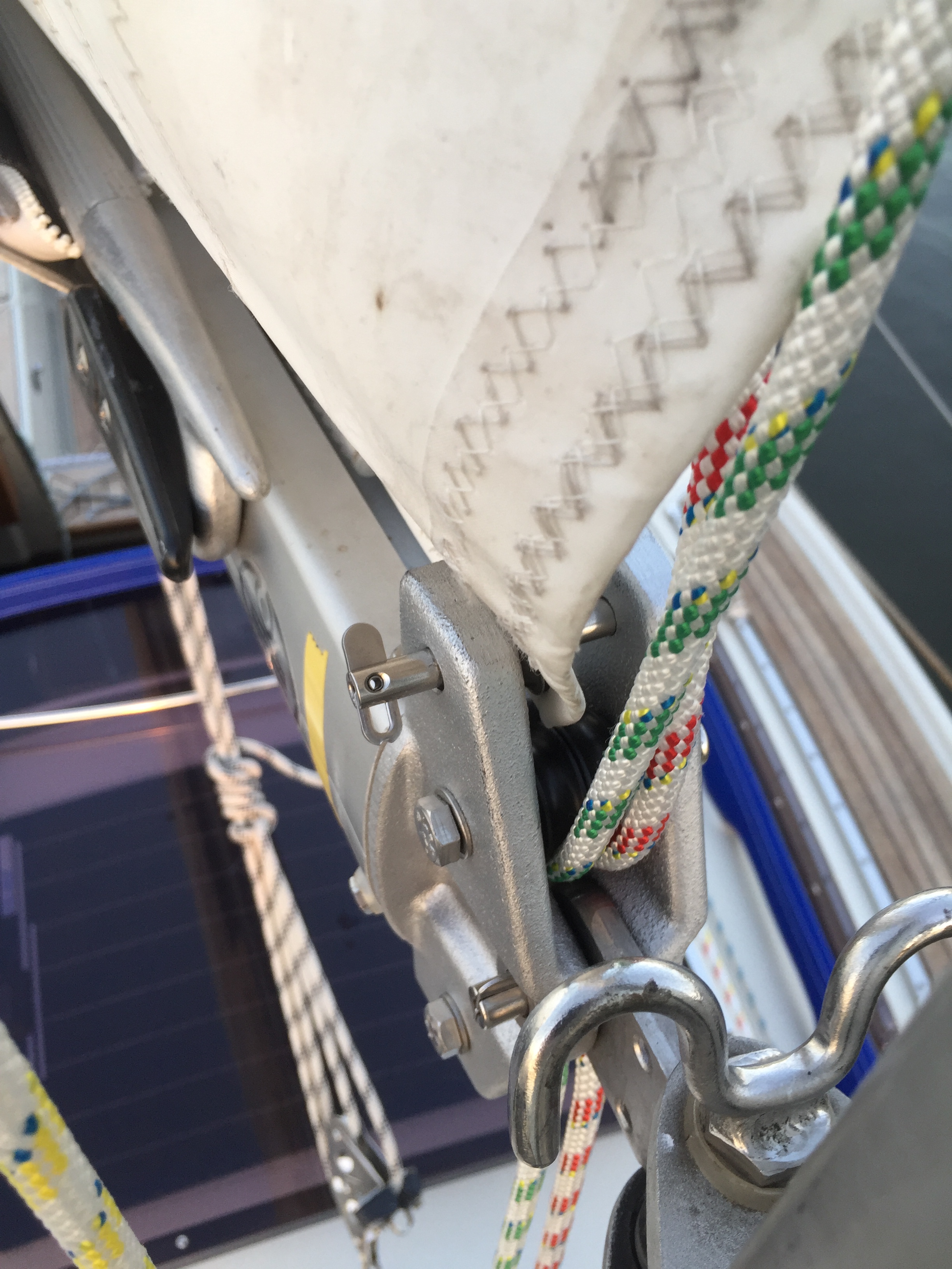 Ich würde es definitiv so wie Uli machen. Diese Lösung war aber schon installiert (verbastelt?) Ich glaube es ist eine gängige Methode auch auf grösseren Schiffen, dass das Grosssegel am Mast eingehängt werden muss.