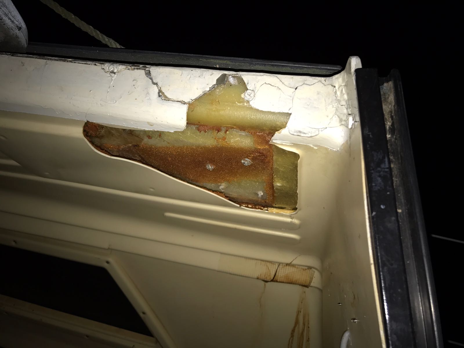 Das Kajütdach hängt durch, ist vergilbt und hat Risse und ist spröde, ein Teil ist ganz weggebrochen.