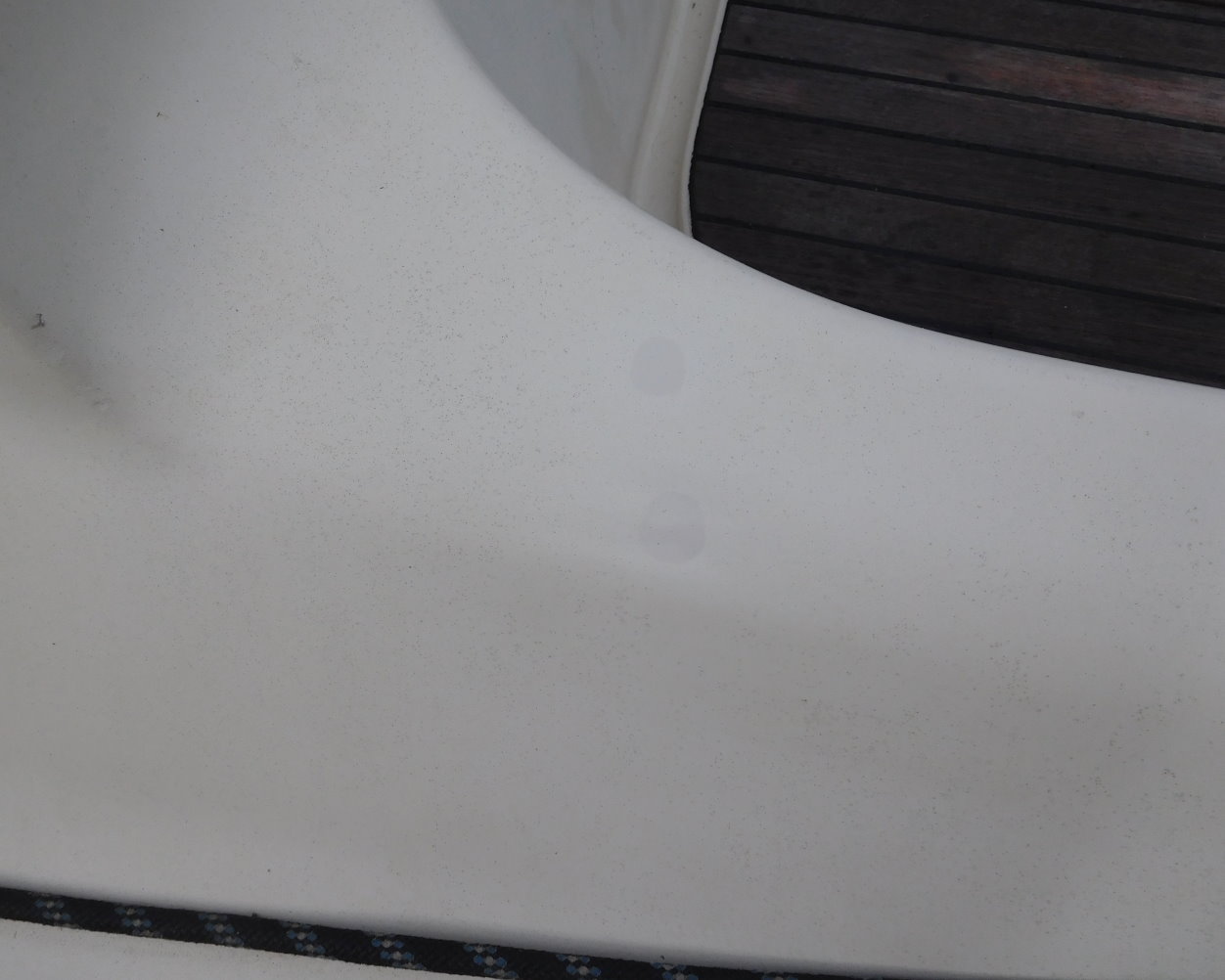 bei meiner Dy25, Bj. 85, sollte das Gelcoat "kieselweiß" passen. Doch seit einigen Jahren ist der gelieferte Farbton etwas dunkler. Anbei ein Bild, wo ich am Süllrand 2 Schraublöcher von der Persenning zugespachtelt und mit dem Gelcoat kieselweiß versiegelt habe. Man sieht recht deutlich den farblichen Unterschied.