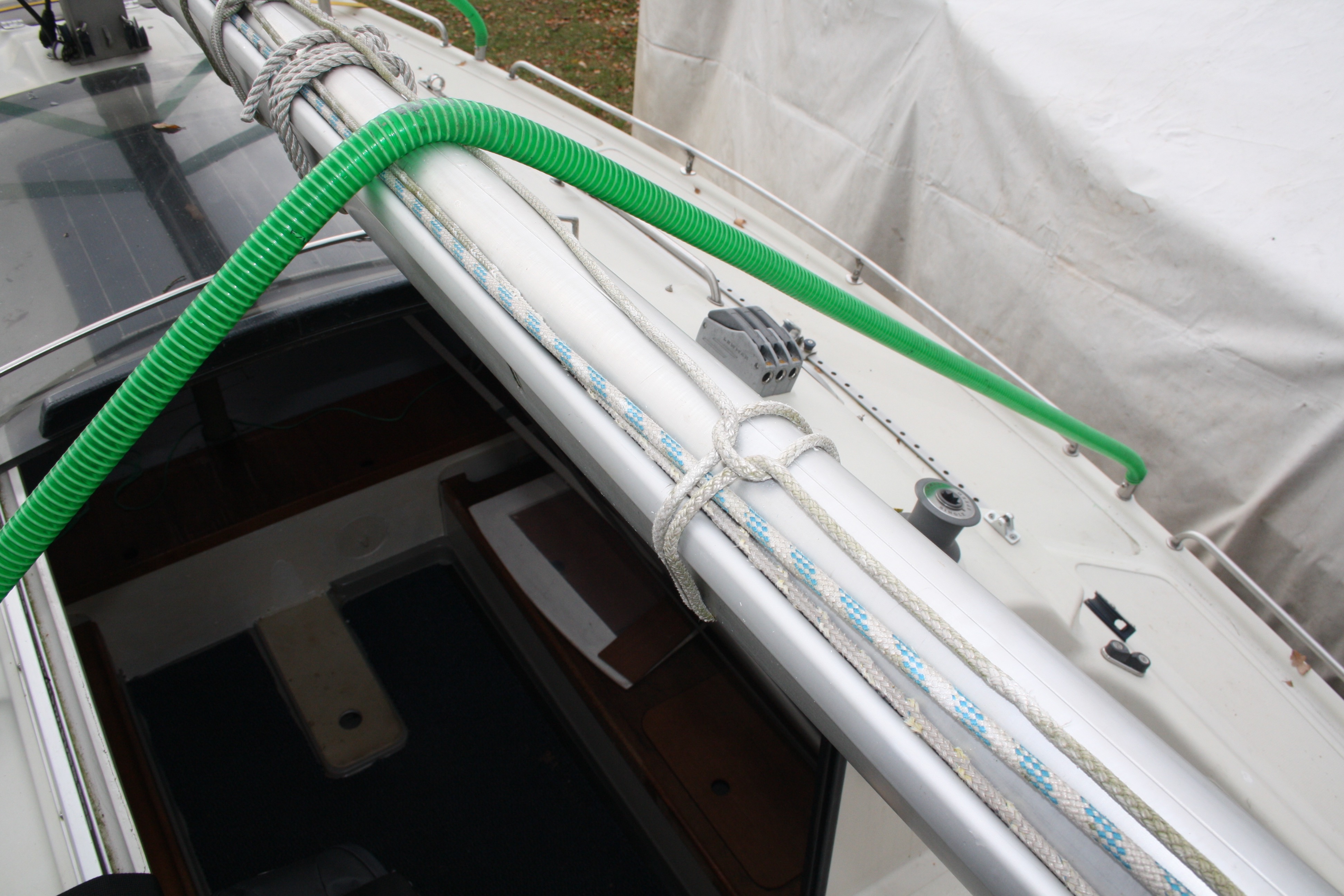 Der Vorbesitzer hat auch eine clevere Lösung für die Unterstützung der Plane gebastelt: Plastikrohre, mit einer Hülse an den Rehlingsaufnahmen, bzw der Hilfswantenaufnahme über den gelegten Mast gespannt.