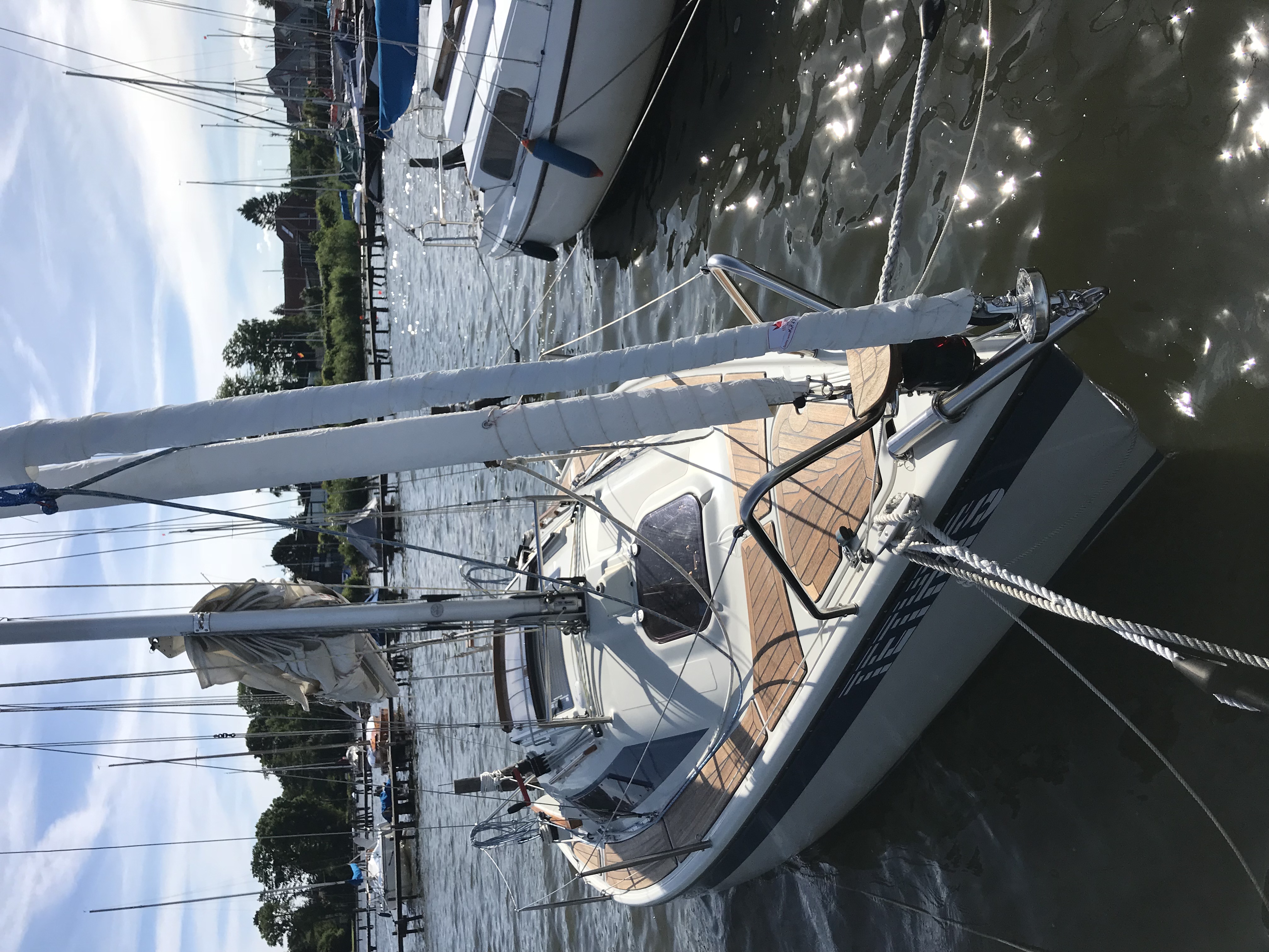 Wie es aussieht, lässt du den Gennakerbaum die ganze Saison angeschlagen. Stört der nicht, wenn man am Steg über den Bug das Schiff verlassen will?