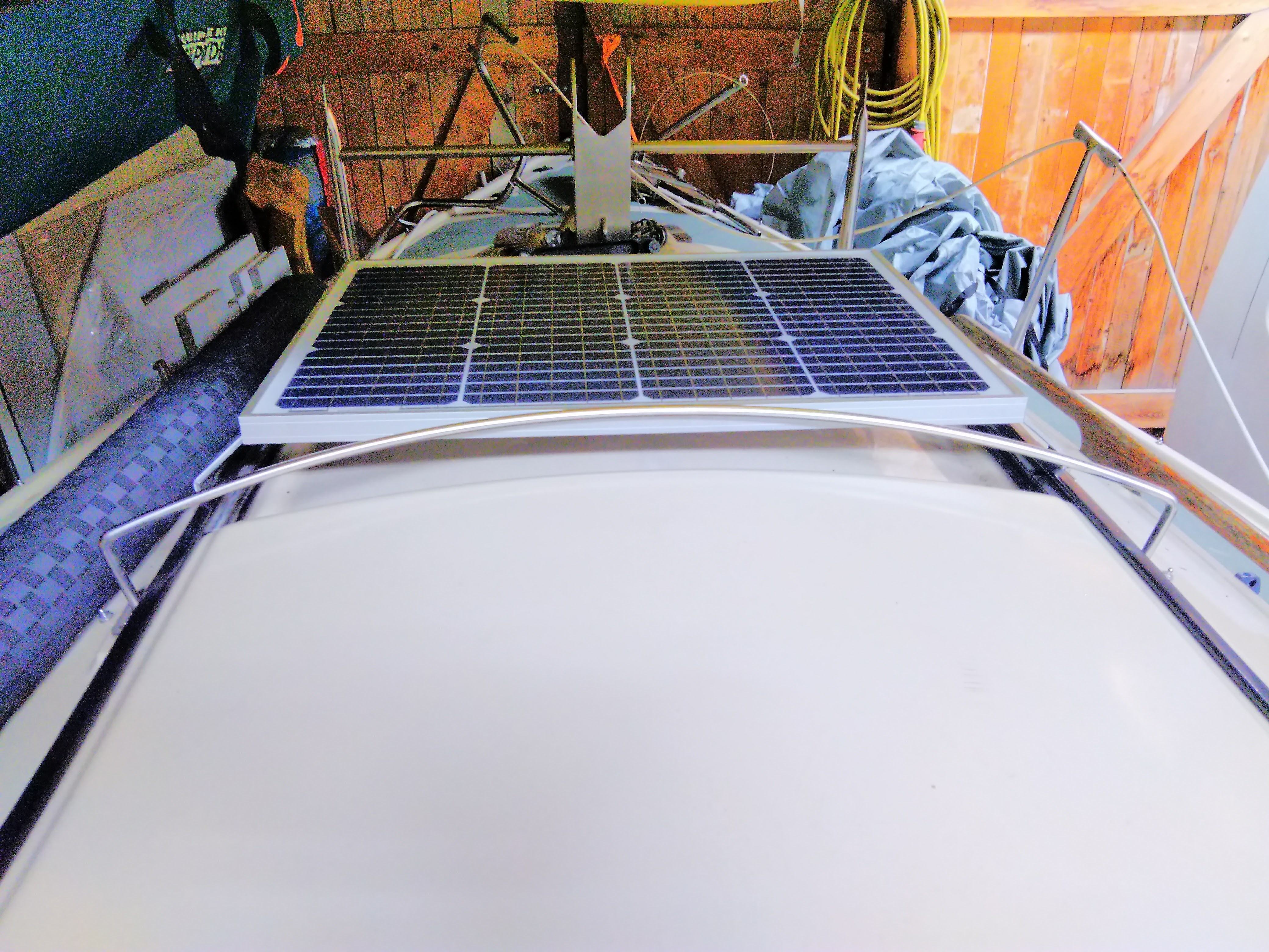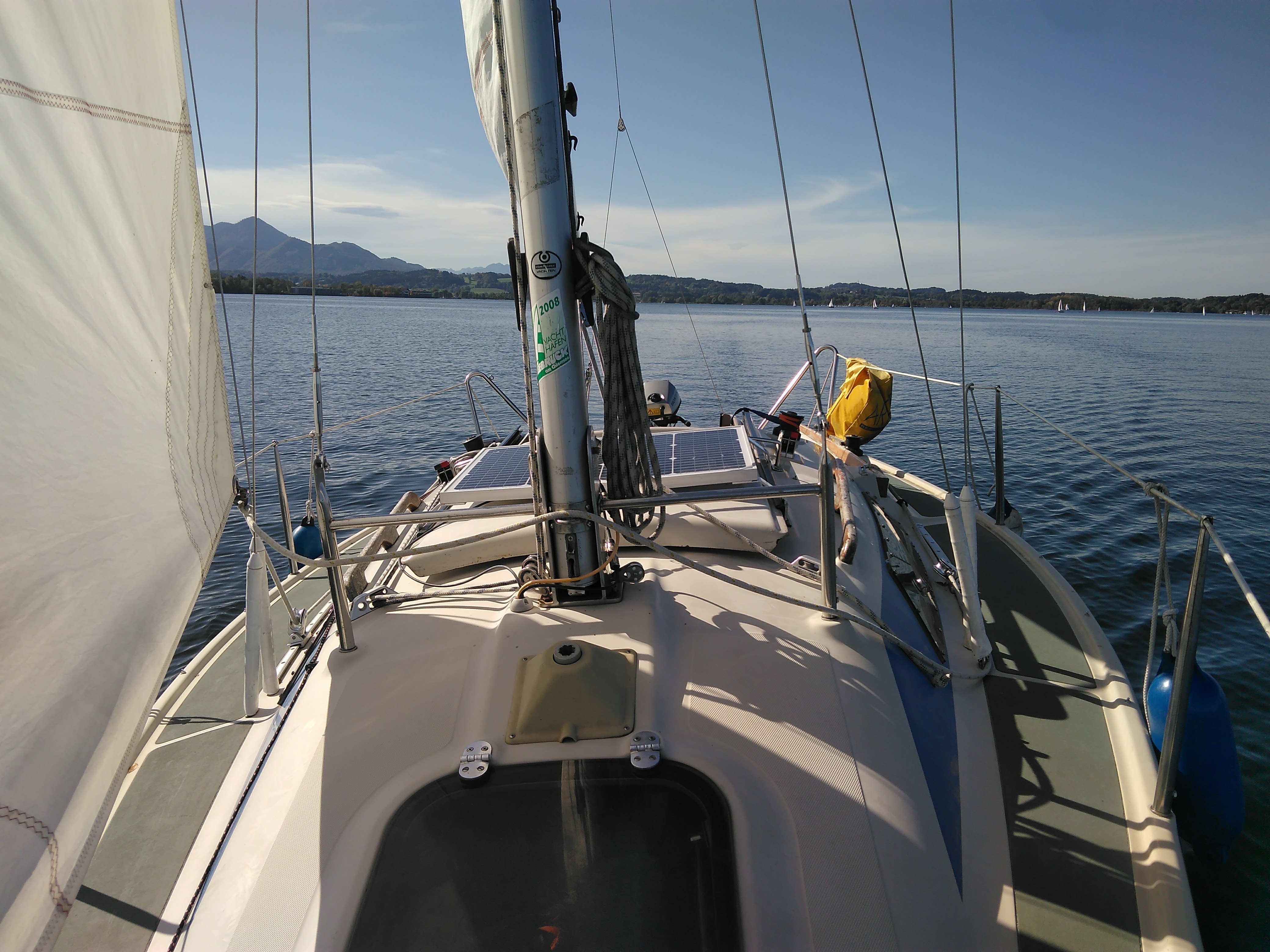 Auf meiner 25er ist das vom Voreigner so gelöst. Ich habe ein begehbares Modul auf der Fläche zwischen Maststuhl und Schiebeluk. Es ist dort mit 4 Gummileinen an den Handläufen fixiert. Das Gummikabel geht dann auf BB in der Aluschiene nach achtern und am Ende der Schiene in die Kajüte. Dort dann durch eine Bohrung hinter der Trennwand im Schrank nach unten zum Solarregler.