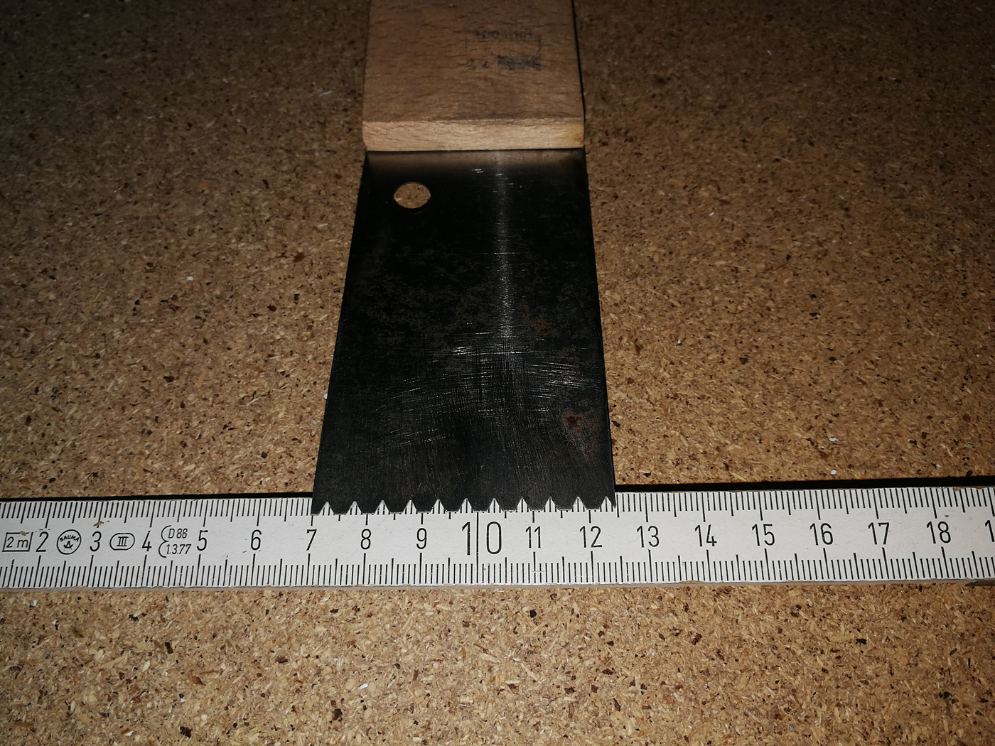 Habe mir vom Baumarkt den ganz normalen Flächenkleberspachtel besorgt und diesen mir dann mit der Flex entsprechend zugeschniten (etwas anderes gab es hier nicht).