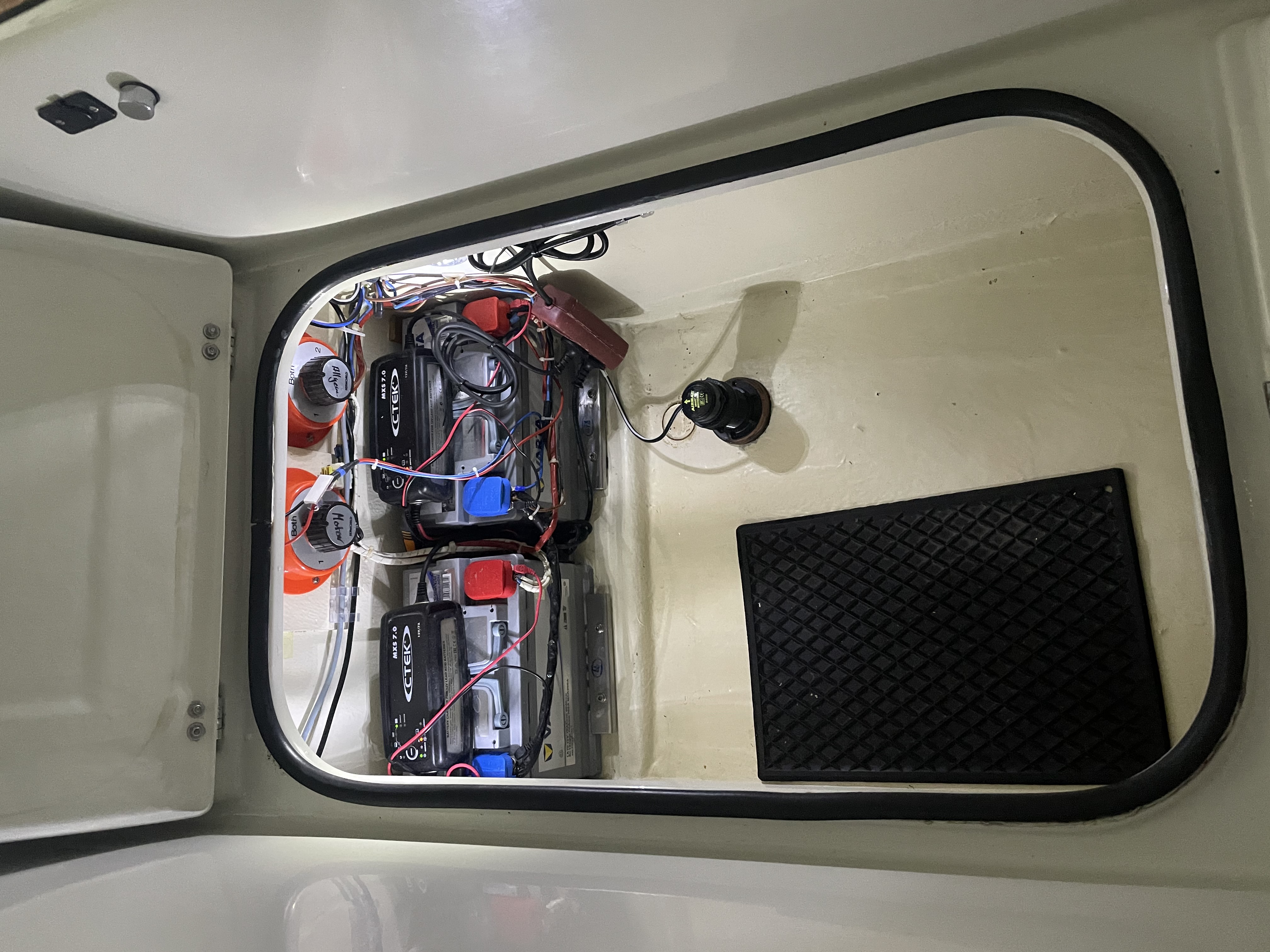 spring ich halt vor dem finalen Anziehen der Krangurte noch mal kurz an Bord, öffne die Klappe im Cockpitboden und peile, daß die Gurte wirklich nicht auf die Gebereinheit drücken ....