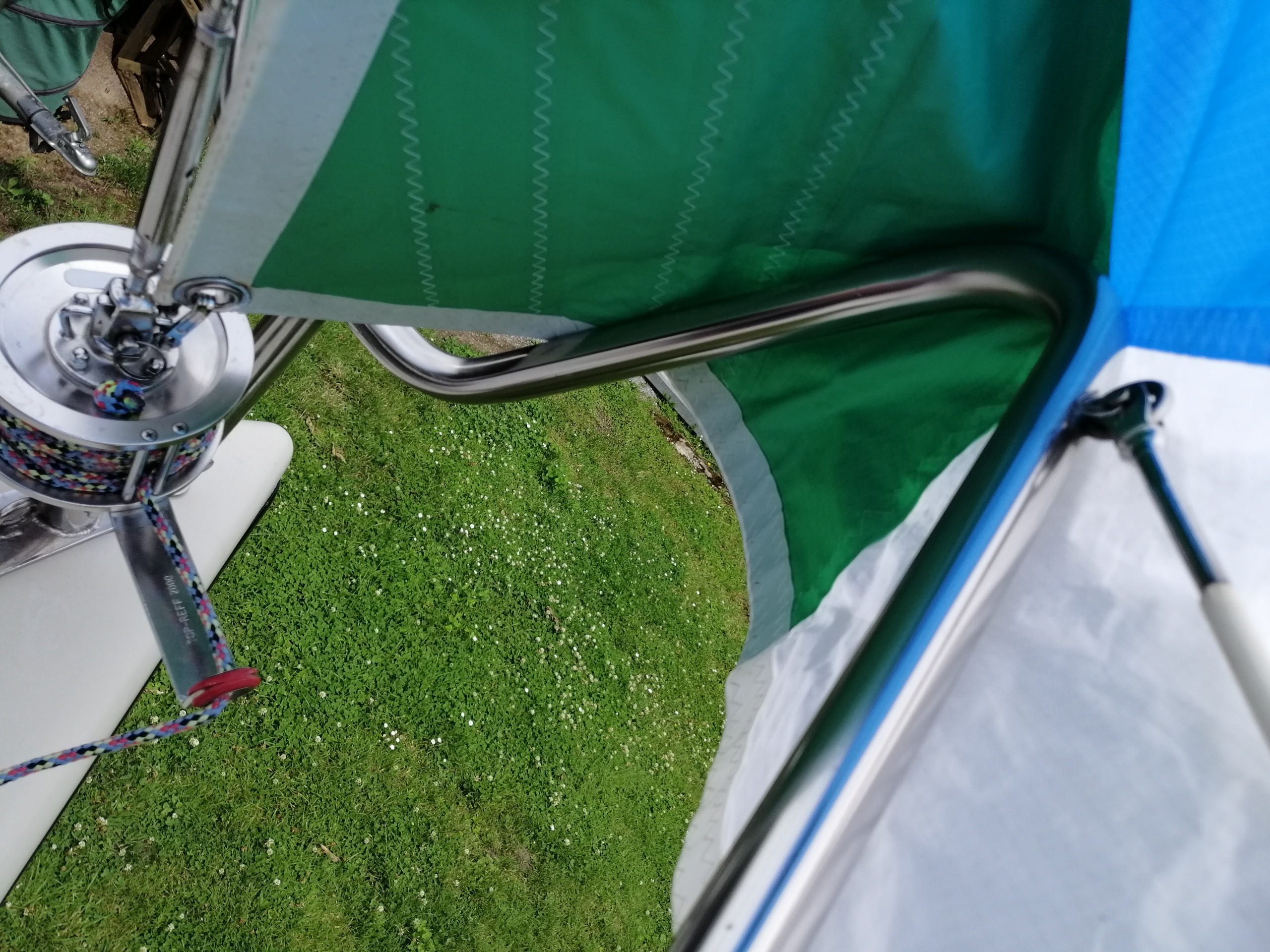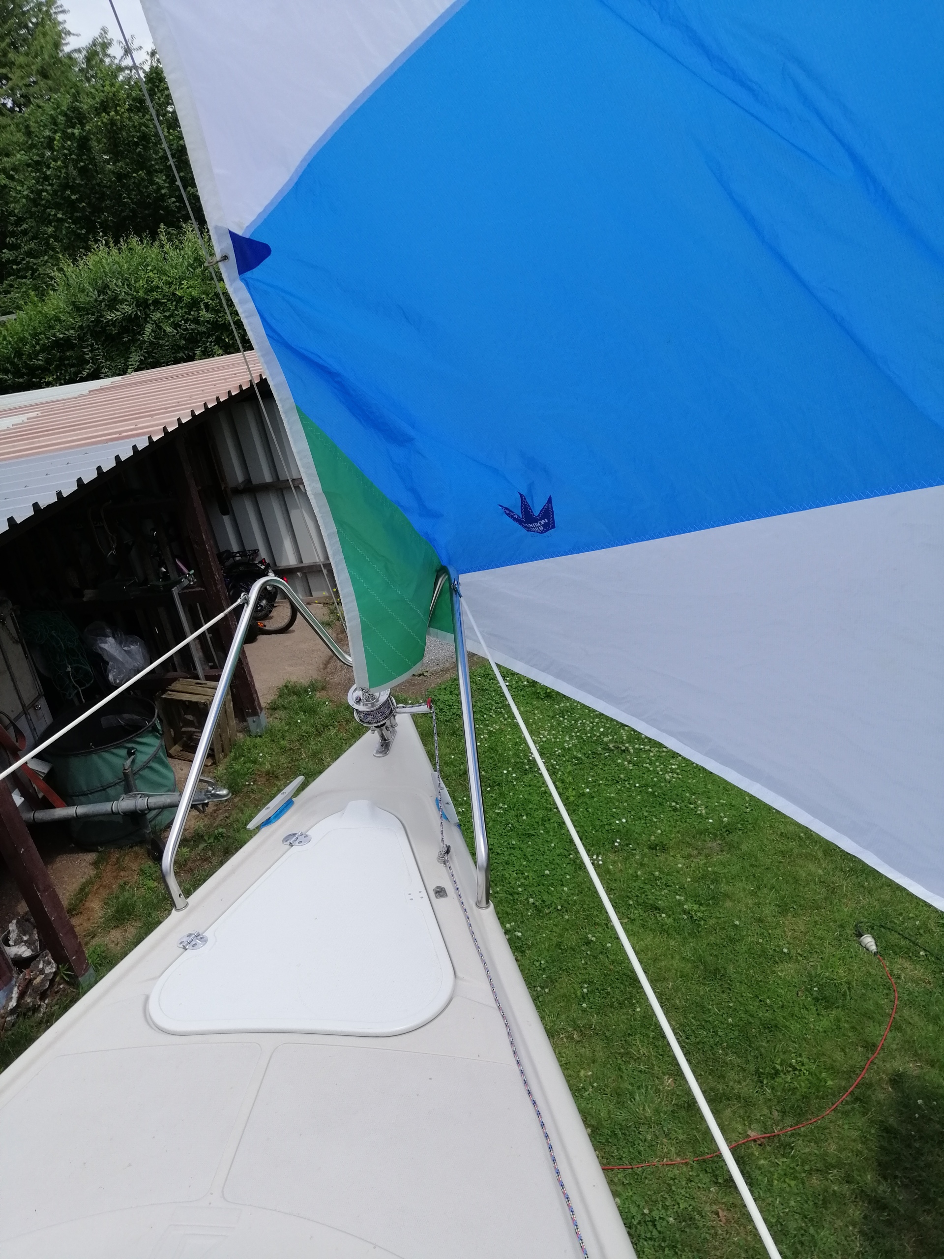 Zu unseren D22-Segelkleidern gehört auch ein Leichtwindsegel. Die Vorbesitzer sagten, es sein ein Booster und auch der Segelsack ist so beschriftet. Vorhin haben wir es mal ausgebreitet und auch angeschlagen. Es besitzt Stagreiter und ist im Verhältnis zu allen anderen unserer Segel, sehr dünn.