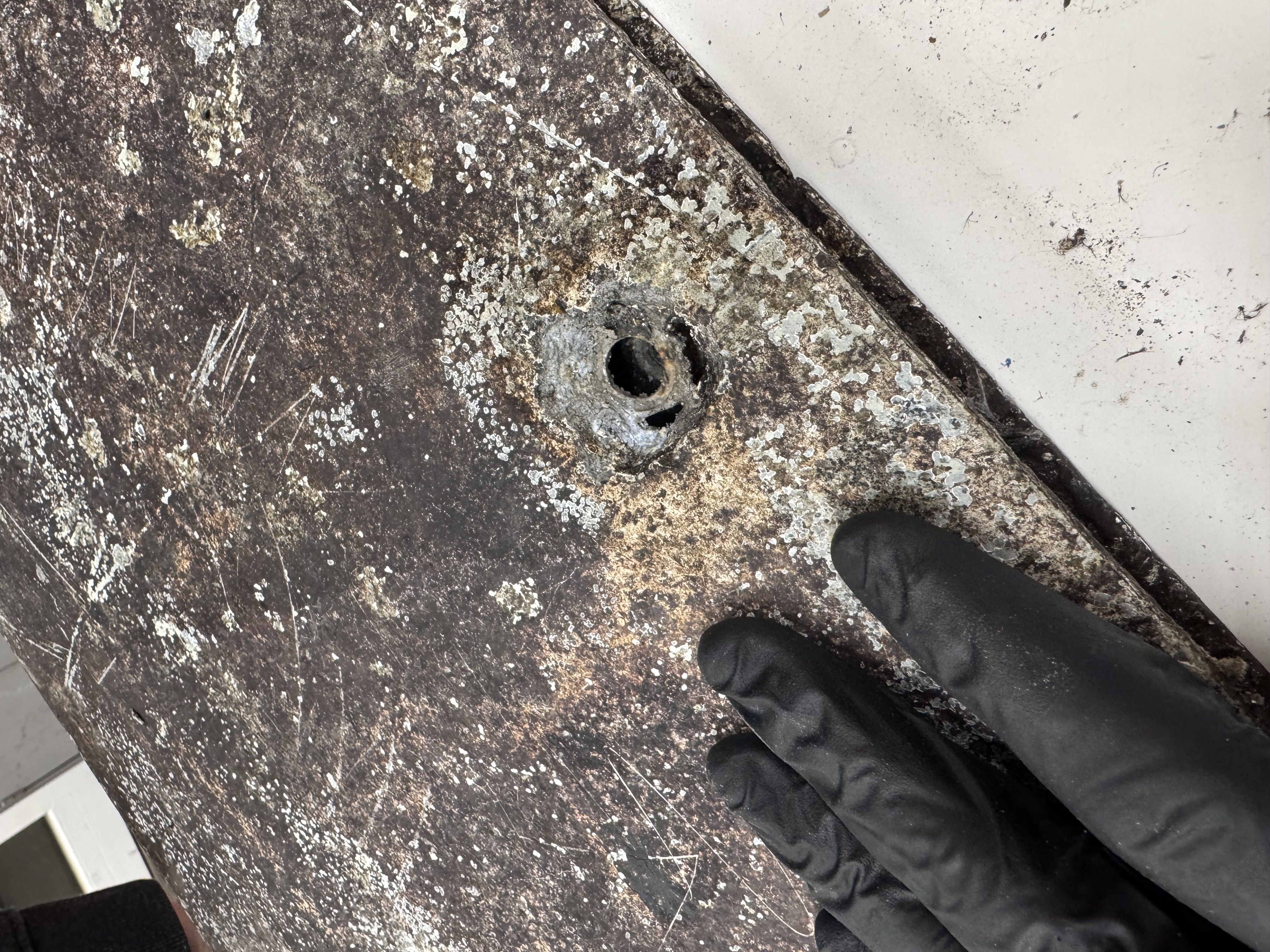Leider hat jedoch an der Schraube des Scharniers der Lochfraß ordentlich zugelangt. So möchte ich darin nichts befestigen, zumal das Sandstrahlen ja erst noch ansteht und das ja auch aufs Material geht.