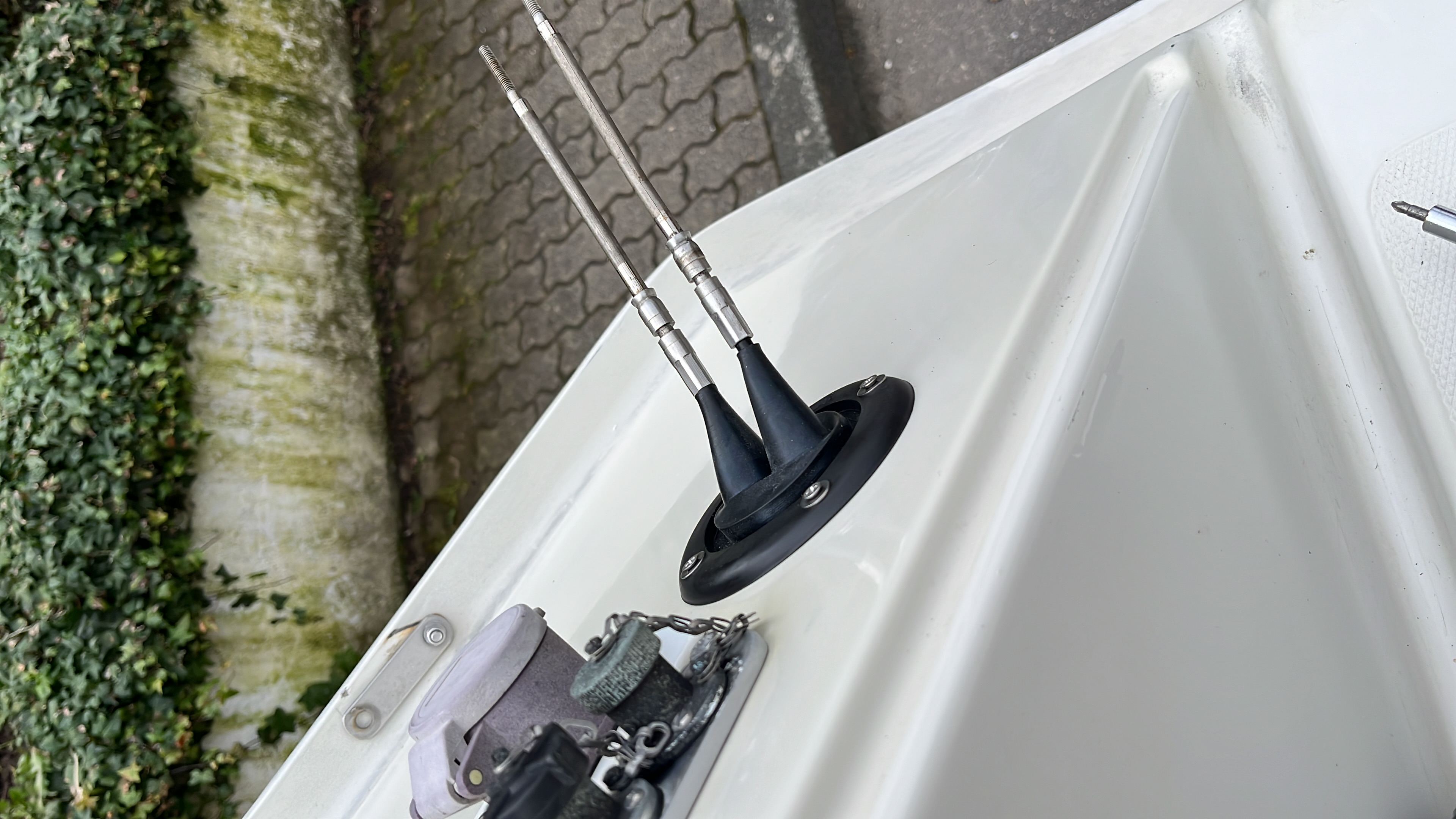 Moin, Nachdem der Vorbesitzer um 1990 rum nur einmal den Benzinmotor und dannach nur noch den Elektromotor genutzt hat war statt eines Auslasses für die Fernbedienungskabel aus der Steuerbord Backskiste nach Achtern eine gut dimensionierte Steckdose für den Elektromotor seitdem dran.