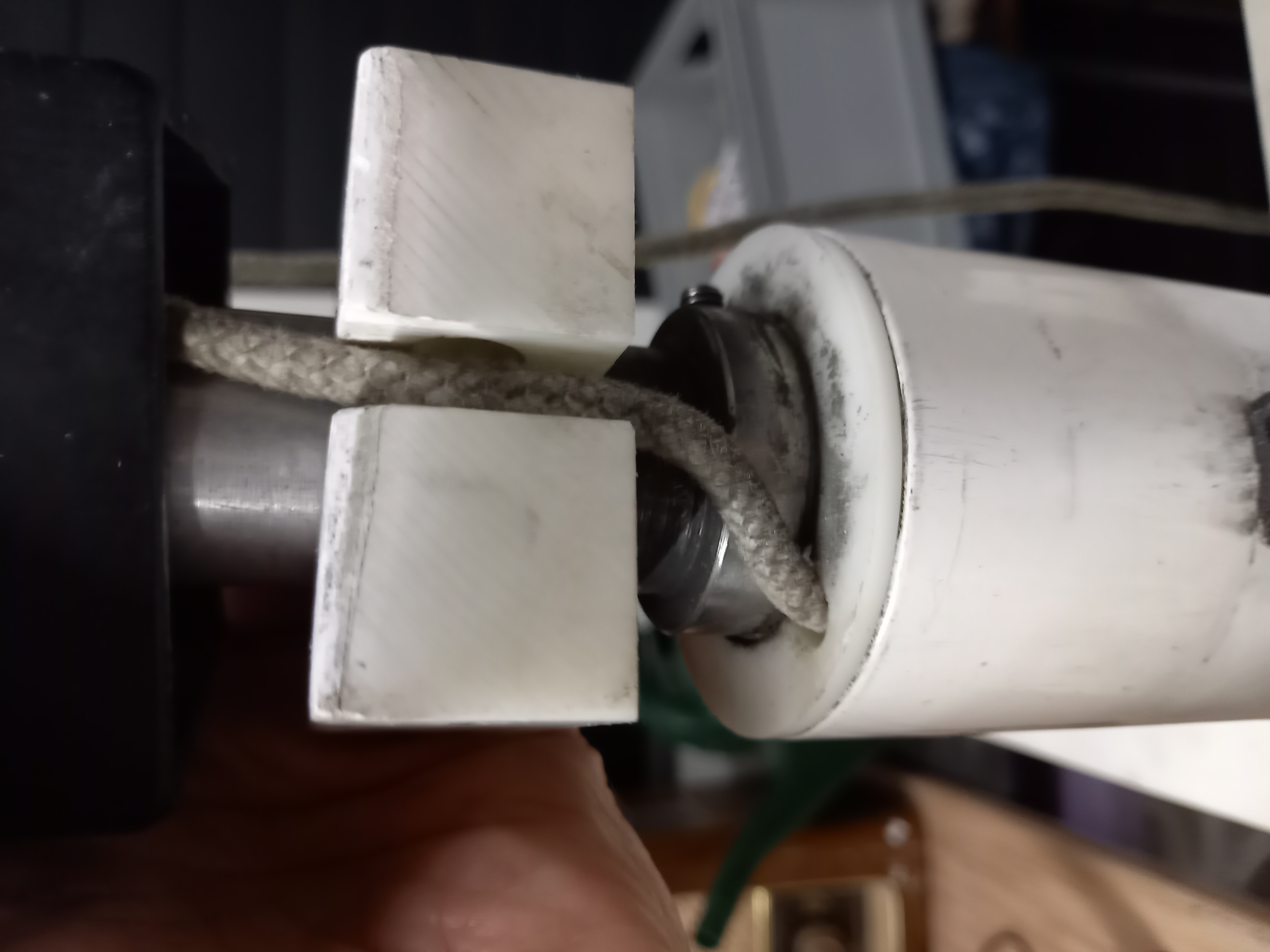 Ganz merkwürdig finde ich zudem die Position des Plastikteils unter der Pinnenbremse. Die Aussparungen in der Bremse und dem Plastikteil liegen nicht übereinander. Sie sind ca. 3 cm seitlich versetzt. Die Niederholleine wird somit fast eingeklemmt wenn der Ring zwischen diesen Bauteilen nicht wäre. Kann aber so auch nicht vernünftig laufen. Bitte die Fotos vergrößern. Gilt somit natürlich auch für die Aufholleine. Es sieht so aus als ob sich diese Plastikteil in dem Rohr verdreht hätte, aber wie hätte das passieren können?